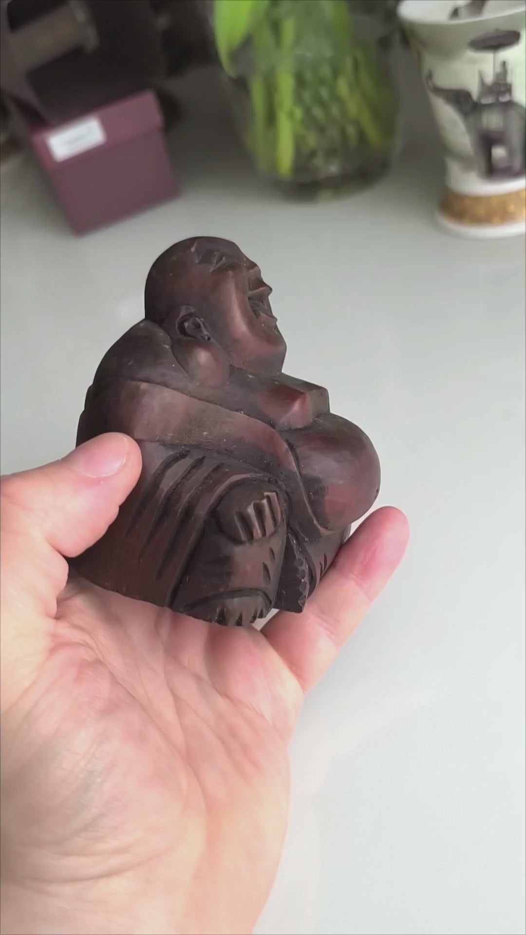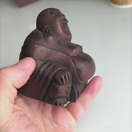 1970 hand-carved wooden Buddha statue in brown paint, smiling in a seated pose. Decorative and spiritual wooden art figure.