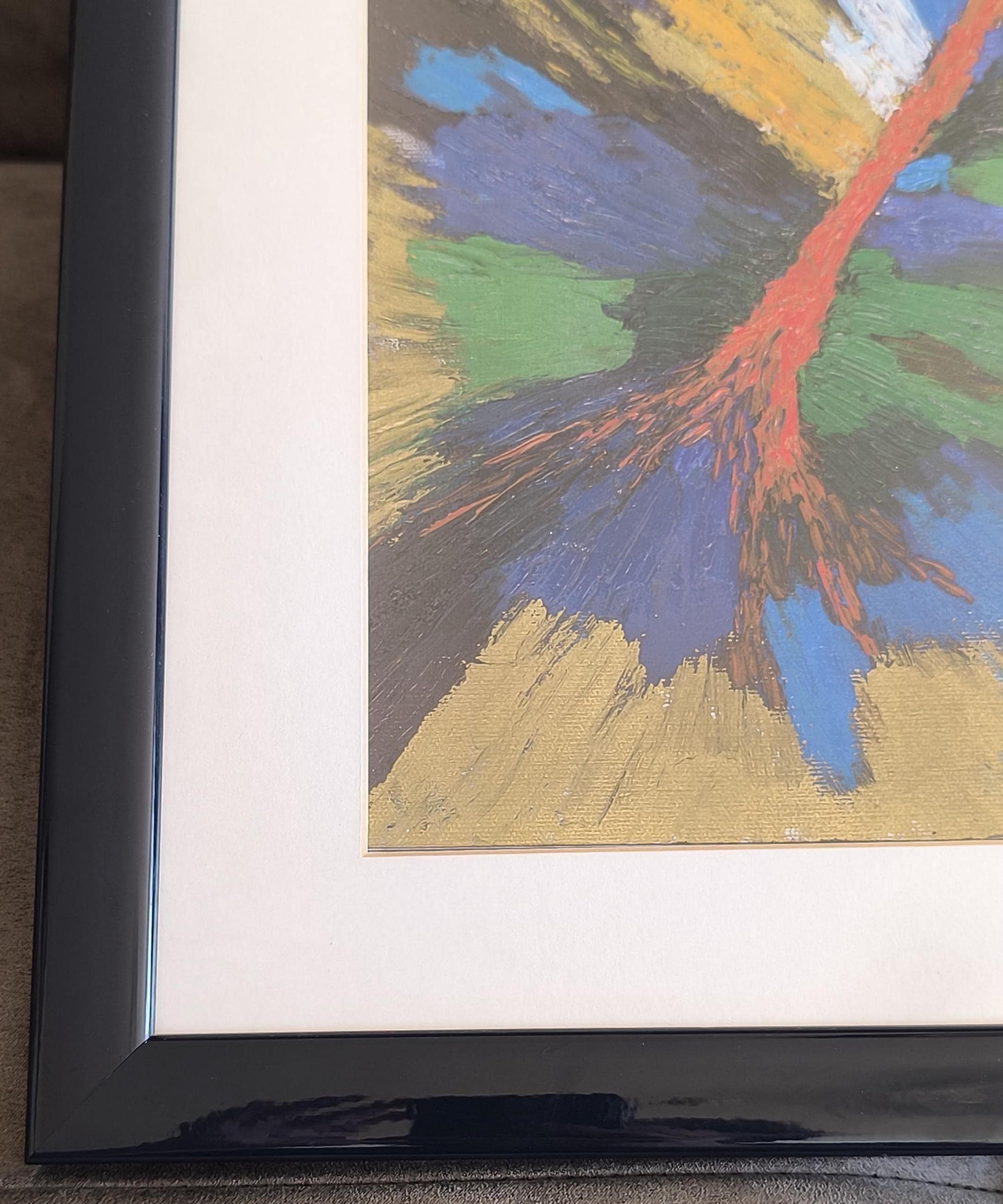 Original abstract acrylic painting on cardboard (mounted), signed lower right as shown “18 Corado 715” (signature reading interpreted from the work). Vertical composition featuring a vibrant, dynamic burst of color executed in energetic brushstrokes. The work is mounted and glued to backing and presented under glass in a wooden frame. Framed dimensions: 38 × 47 cm (with glass); unframed sheet size: 26 × 36 cm. Acquired and brought from Italy; estimated date of acquisition between 1970–1990. Signature and exact artist identity require further research if provenance confirmation is needed.