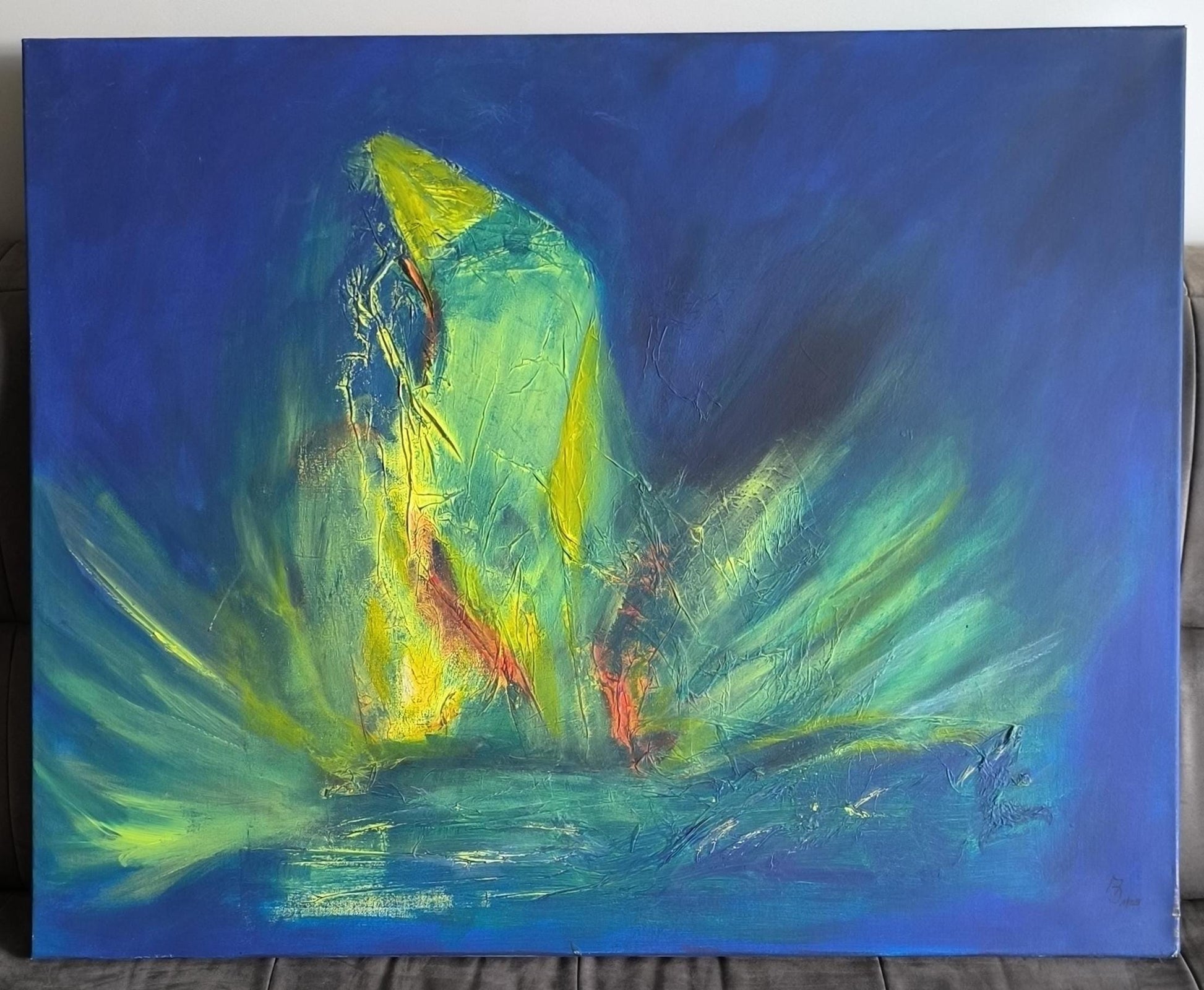 Expressive acrylic painting titled "Phoenix" by German artist Angelika Dampfer, created before 1990. Painted on canvas and signed by the author, this piece measures 80 × 100 cm and is unframed. The composition evokes transformation and rebirth, characteristic of symbolic or abstract expressionism.