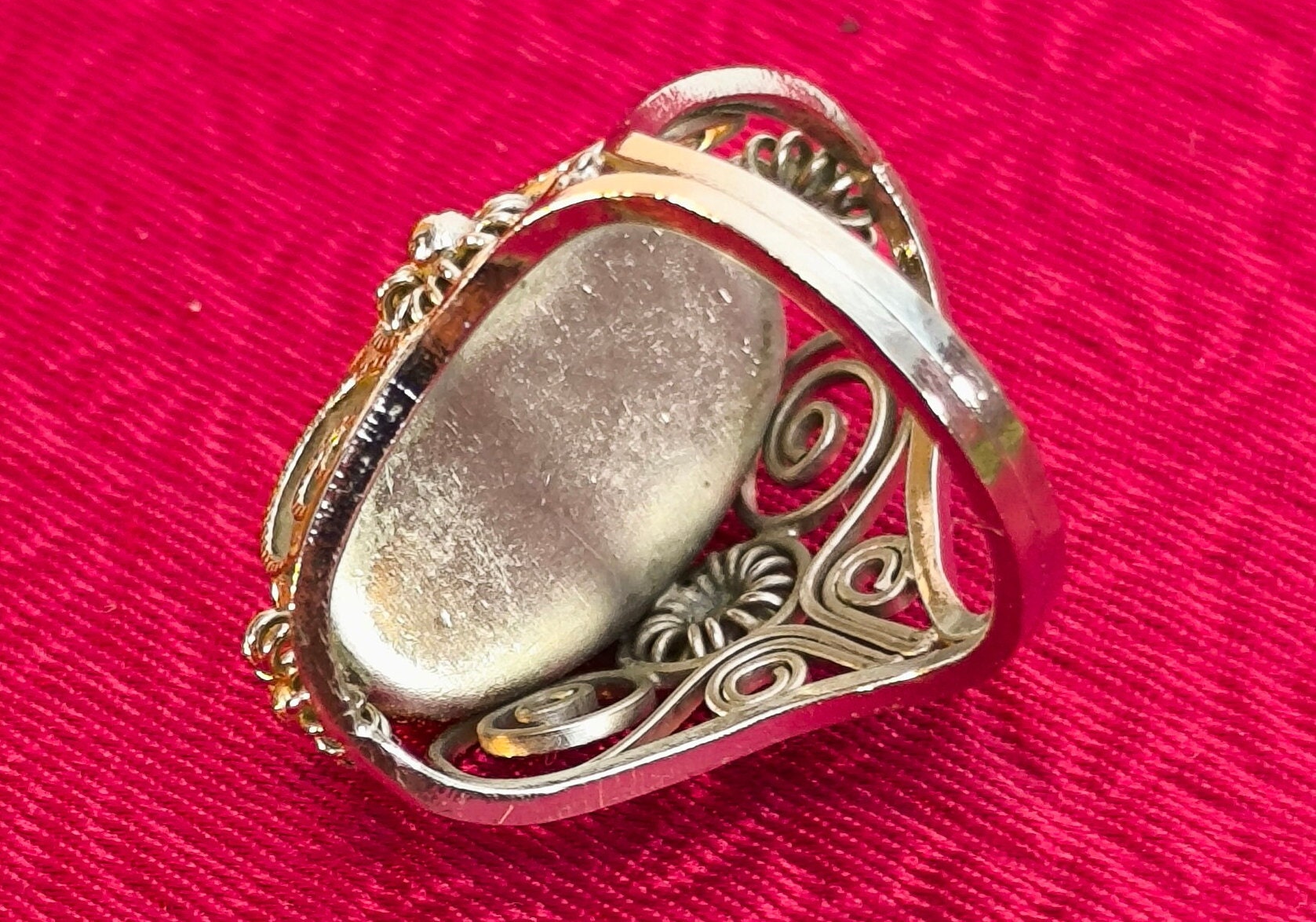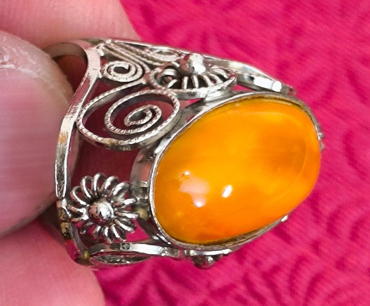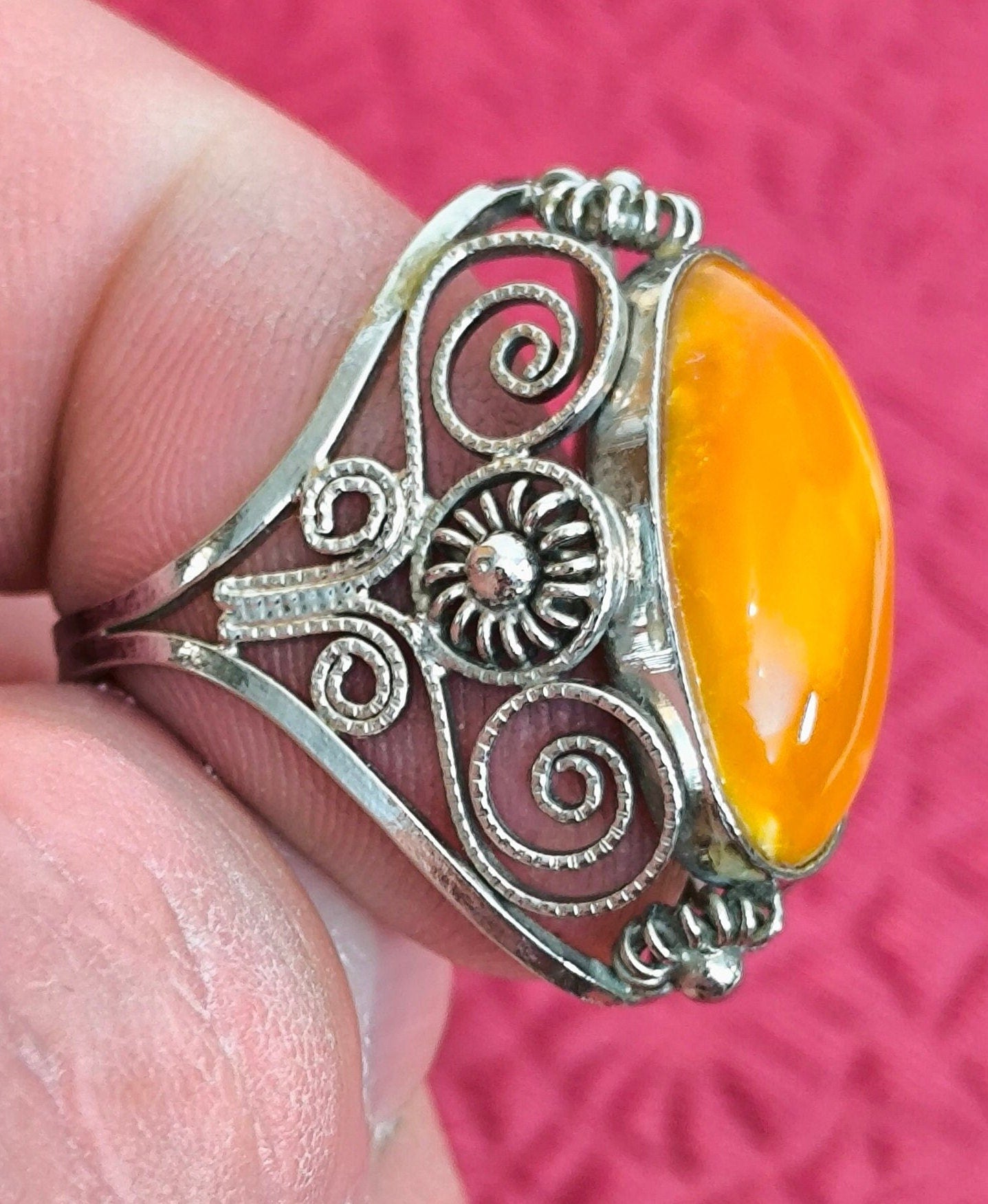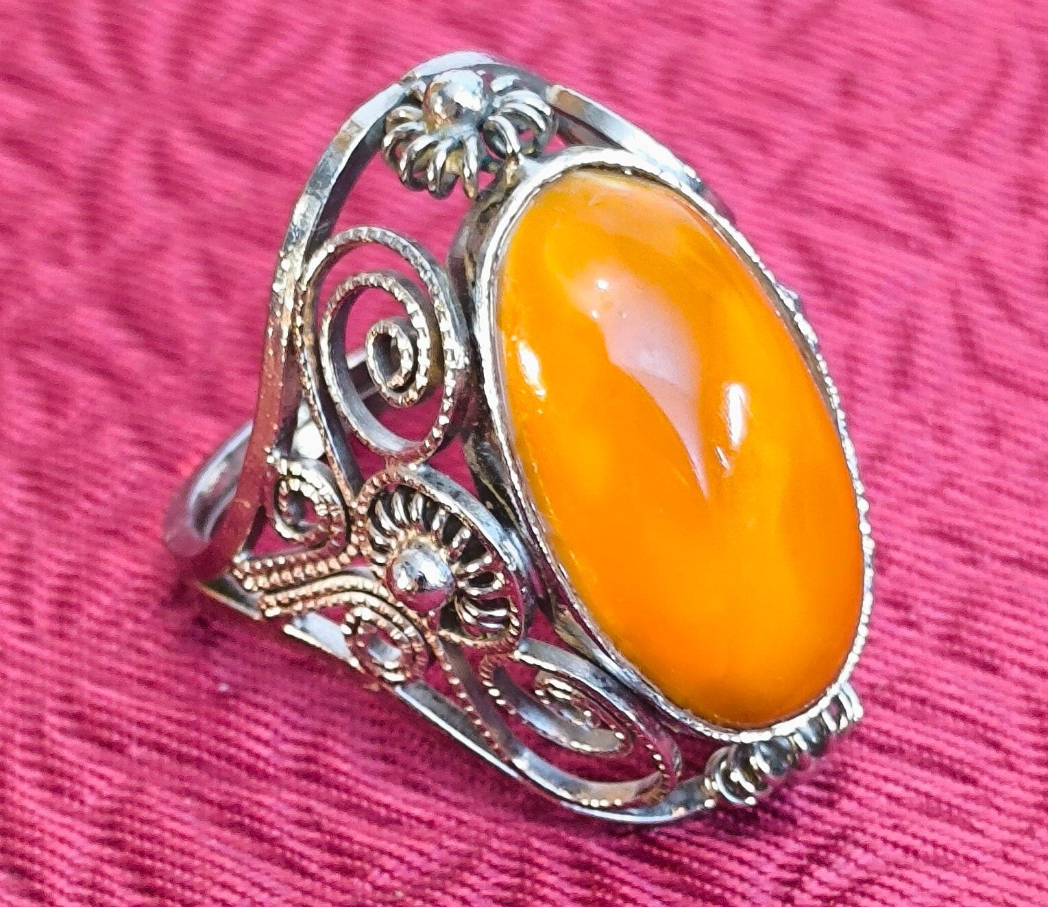 This beautiful vintage Soviet Melchior ring features a large oval-shaped stone of Butterscotch Egg Yolk Baltic Amber. The butterscotch amber stone serves as the centerpiece, exuding warmth and natural beauty. Amber stone size: 22 mm x 12 mm (0.87 in x 0.47 in). This vintage Soviet Melchior ring showcases the beauty of Lithuanian filigree craftsmanship. Handmade in the 1960s, this ring is a stunning piece of jewelry. The total height of the ring is 31 mm (1.22 in). Widest place: 29 mm (1.14 in). Fits finger size: 18 mm (0.71 in).