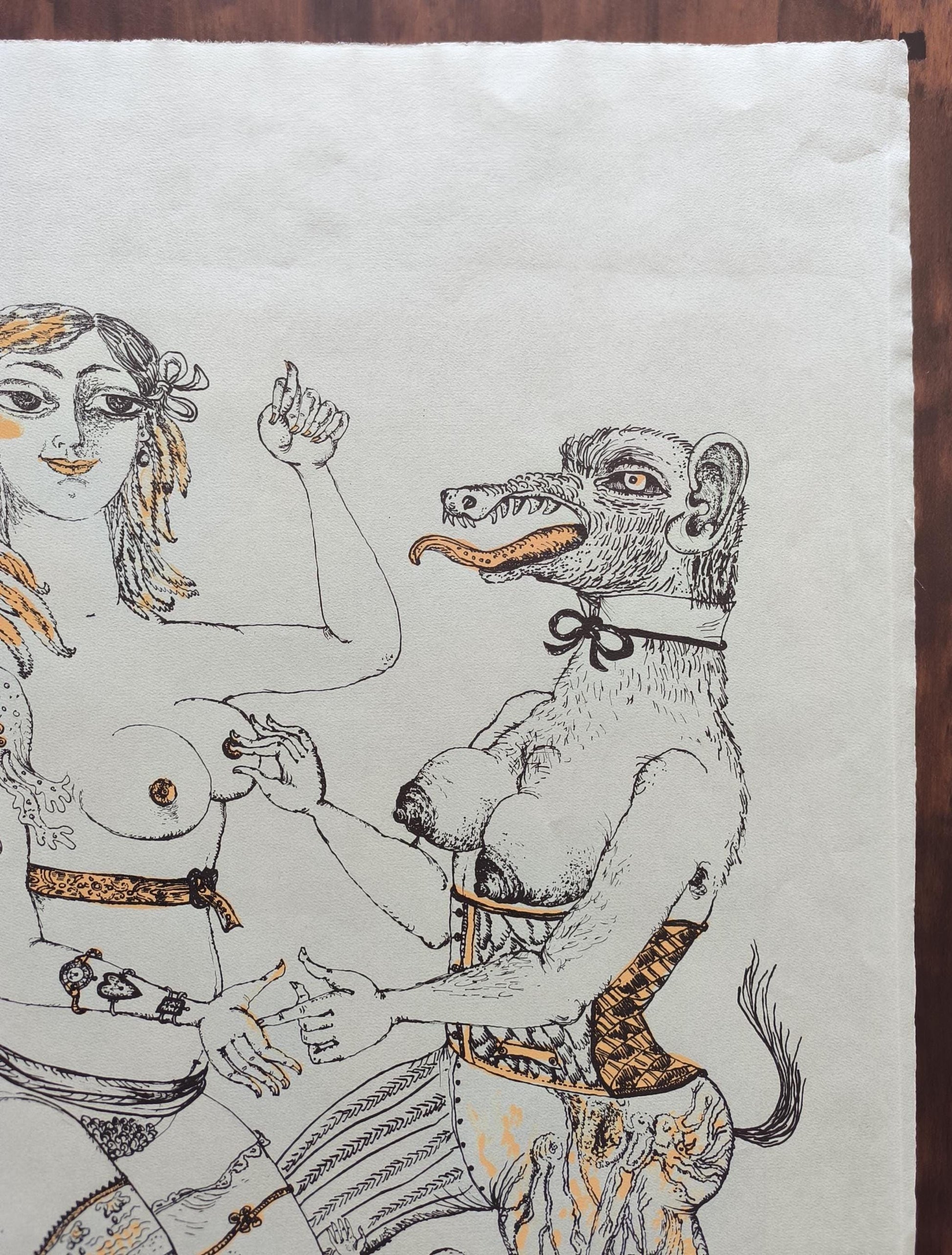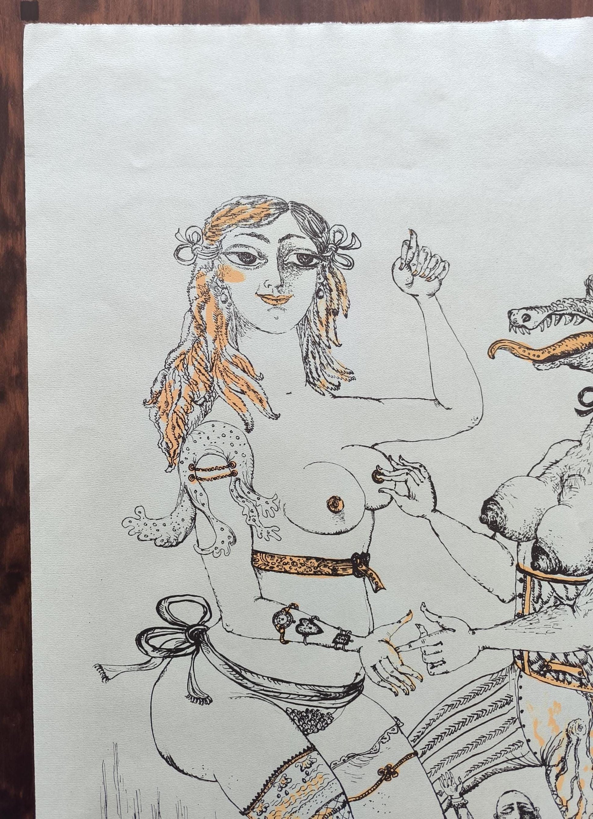 Original 1982 lithograph titled “Eine Bürgermeisterin auf ihrem Bürgermeisterstuhl” (“A Mayor on Her Mayor’s Chair”) by renowned German artist Bele Bachem (1916–2005). This is edition 4 of 100, hand-signed by the artist. Known for her surreal graphic style, Bachem was a celebrated illustrator, scenographer, and writer. The artwork is unframed, size 52×84 cm.