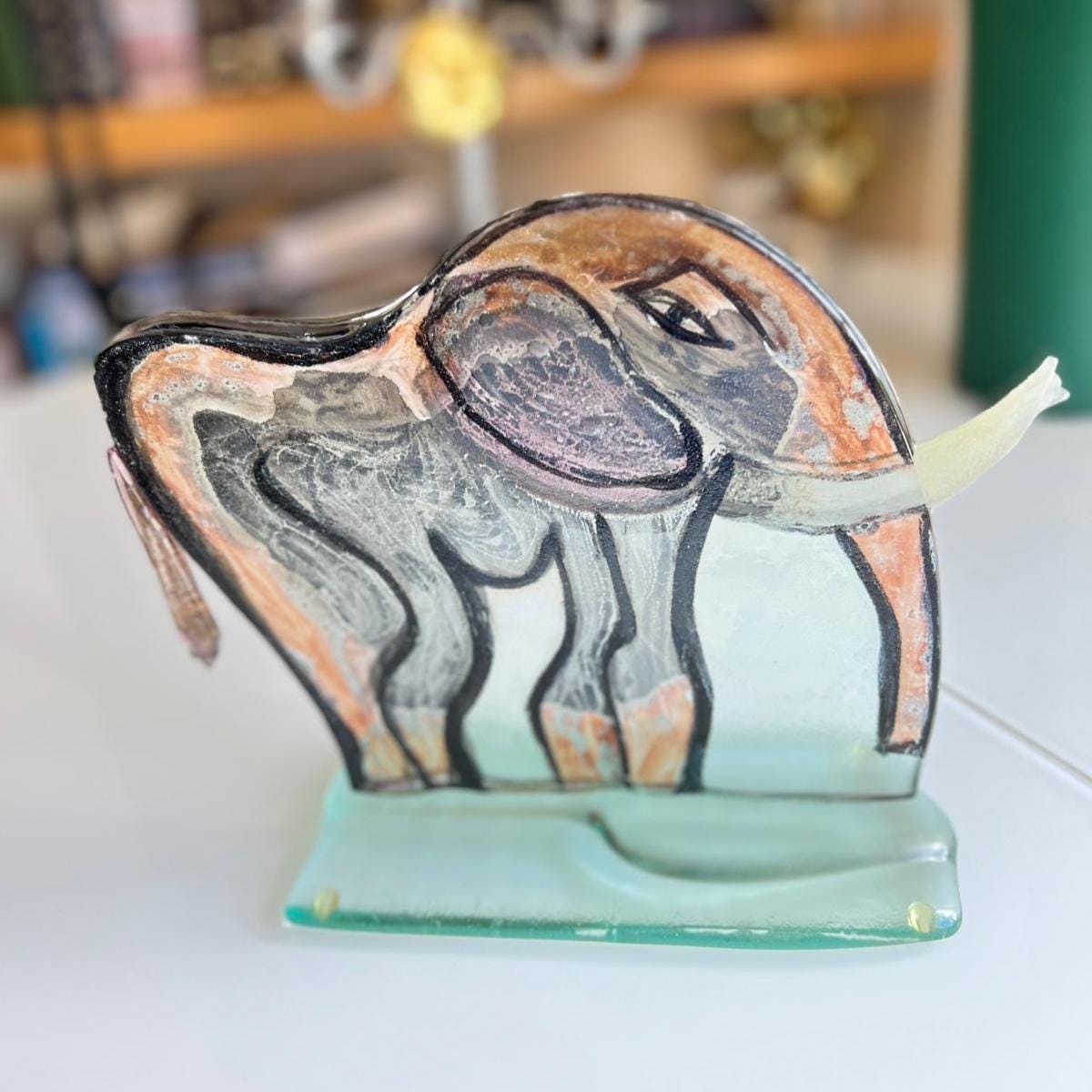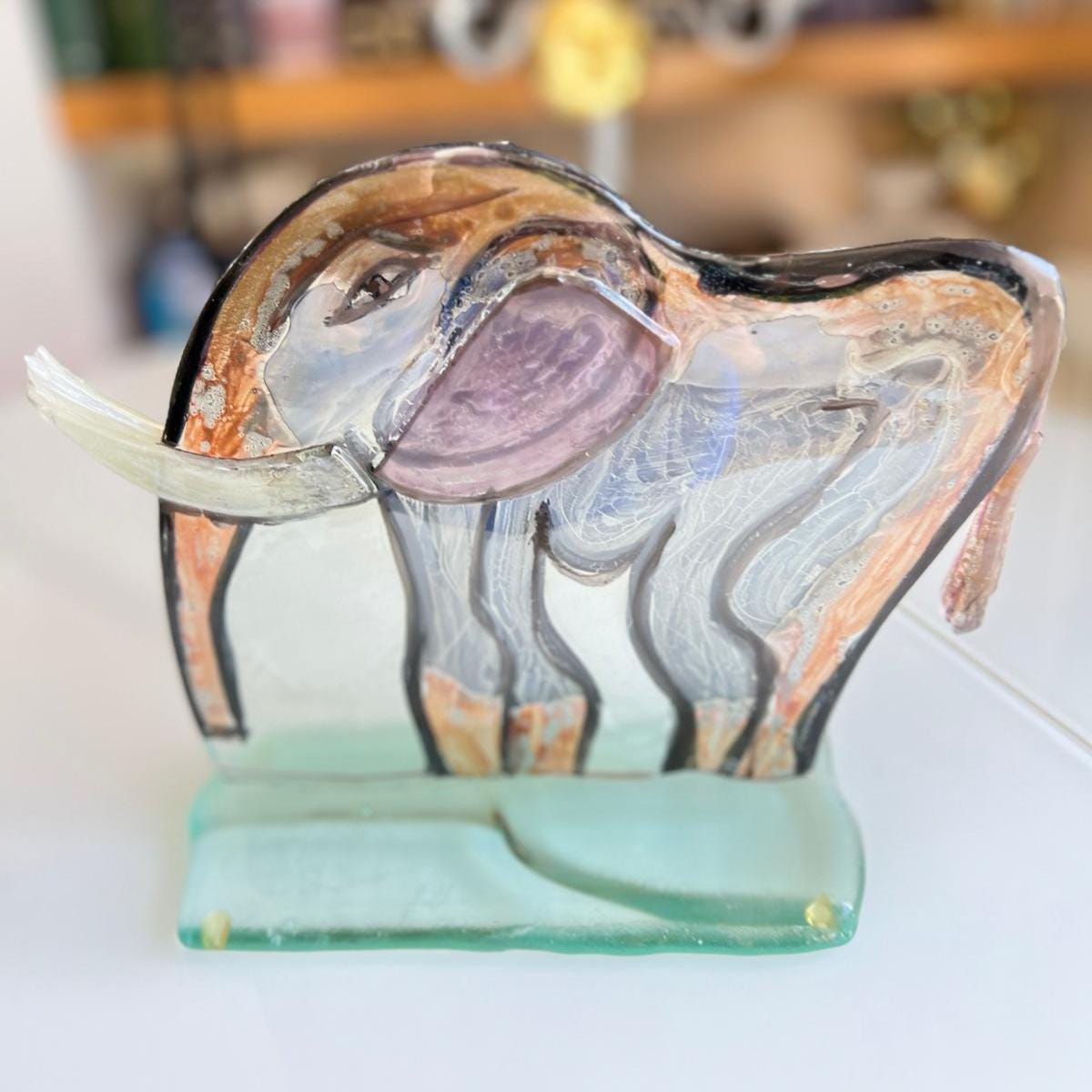 Flat glass abstract elephant sculpture crafted from layered colored glass with tones of black, brown, blue, yellow and violet. The piece stands on a green-tinted glass base formed from two fused planes resembling water and a rising wave. Signed and engraved by the artist with the title “Elefant,” the signature “T. Shas,” and numbered 6/99. Estimated production period: 1980–1990. No chips, cracks or repairs noticed.