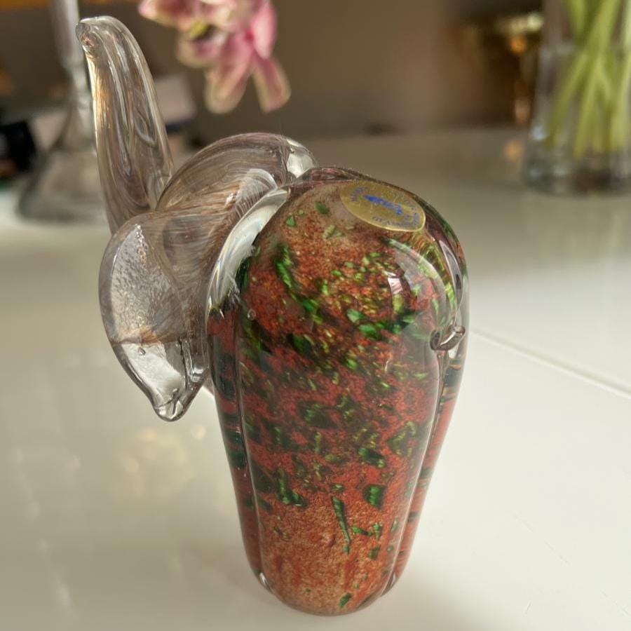 Experience a piece of retro technology with this classic desktop telephone. This Handmade glass elephant by MTARFA Glassblowers Malta, produced around 1980. The figure has a raised trunk, clear sculpted head with brown filament details, and a vibrant body shifting from red to gold with green inclusions under a transparent layer. Height 13 cm, length 9 cm, with original gold foil label.