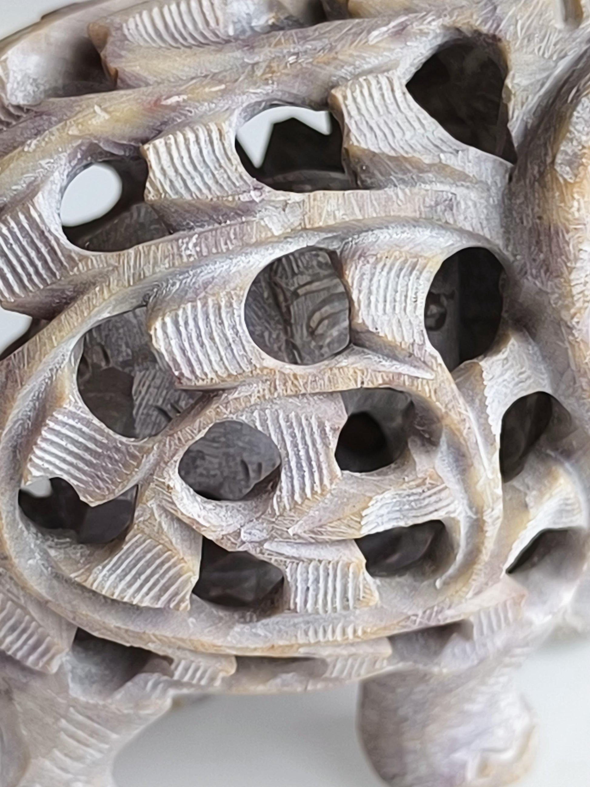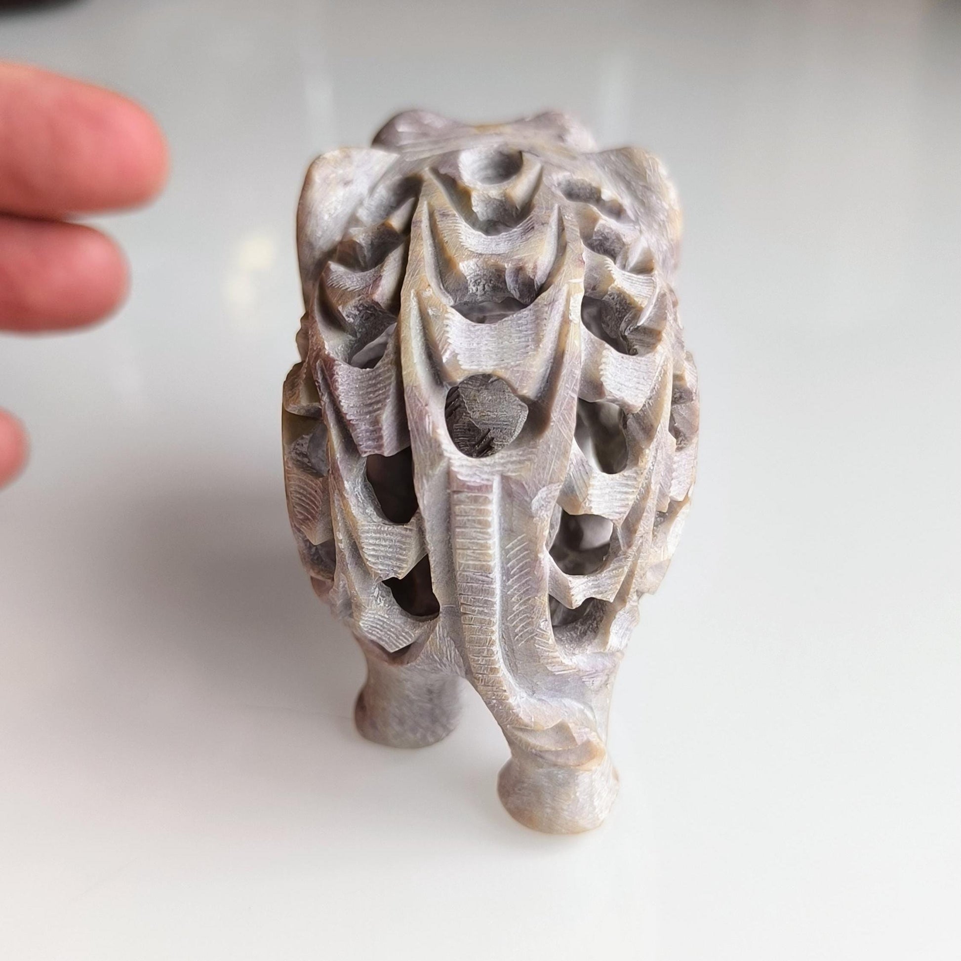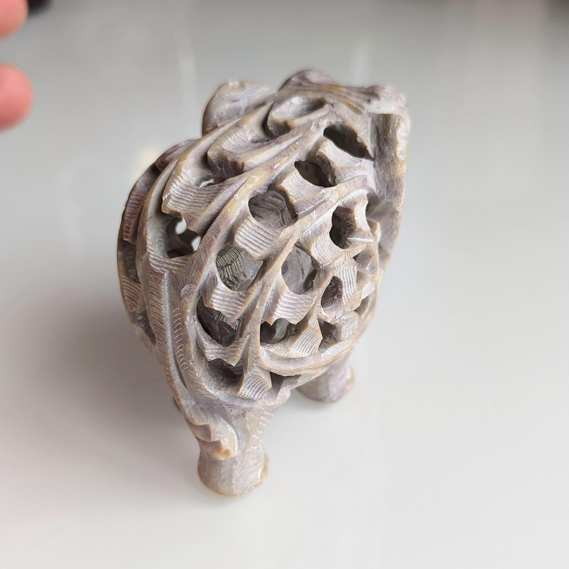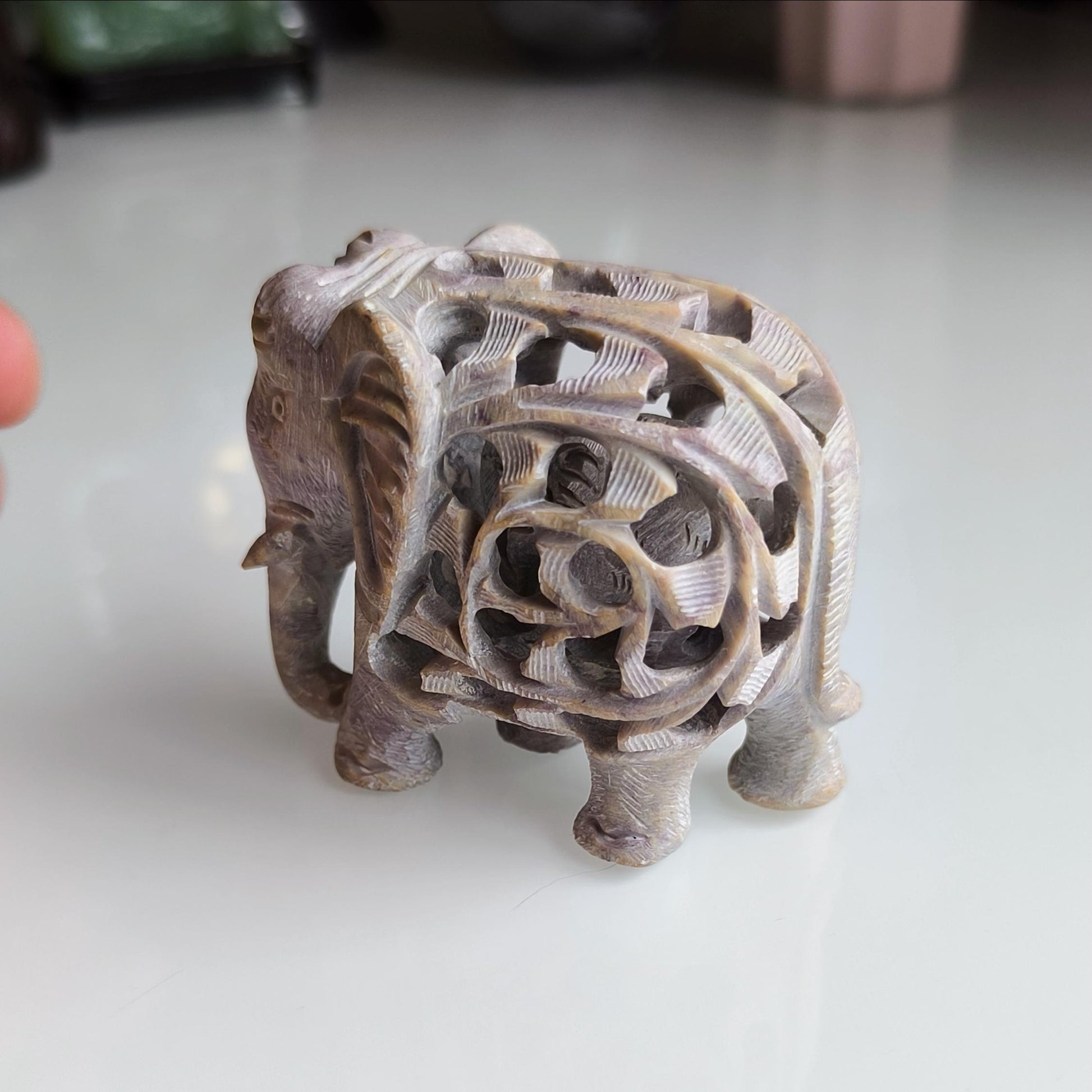 Handmade, small gray stone elephante with a baby elephant inside. This detailed 1980s piece reflects traditional craftsmanship and cultural artistry. A unique decorative collectible for home or office.
