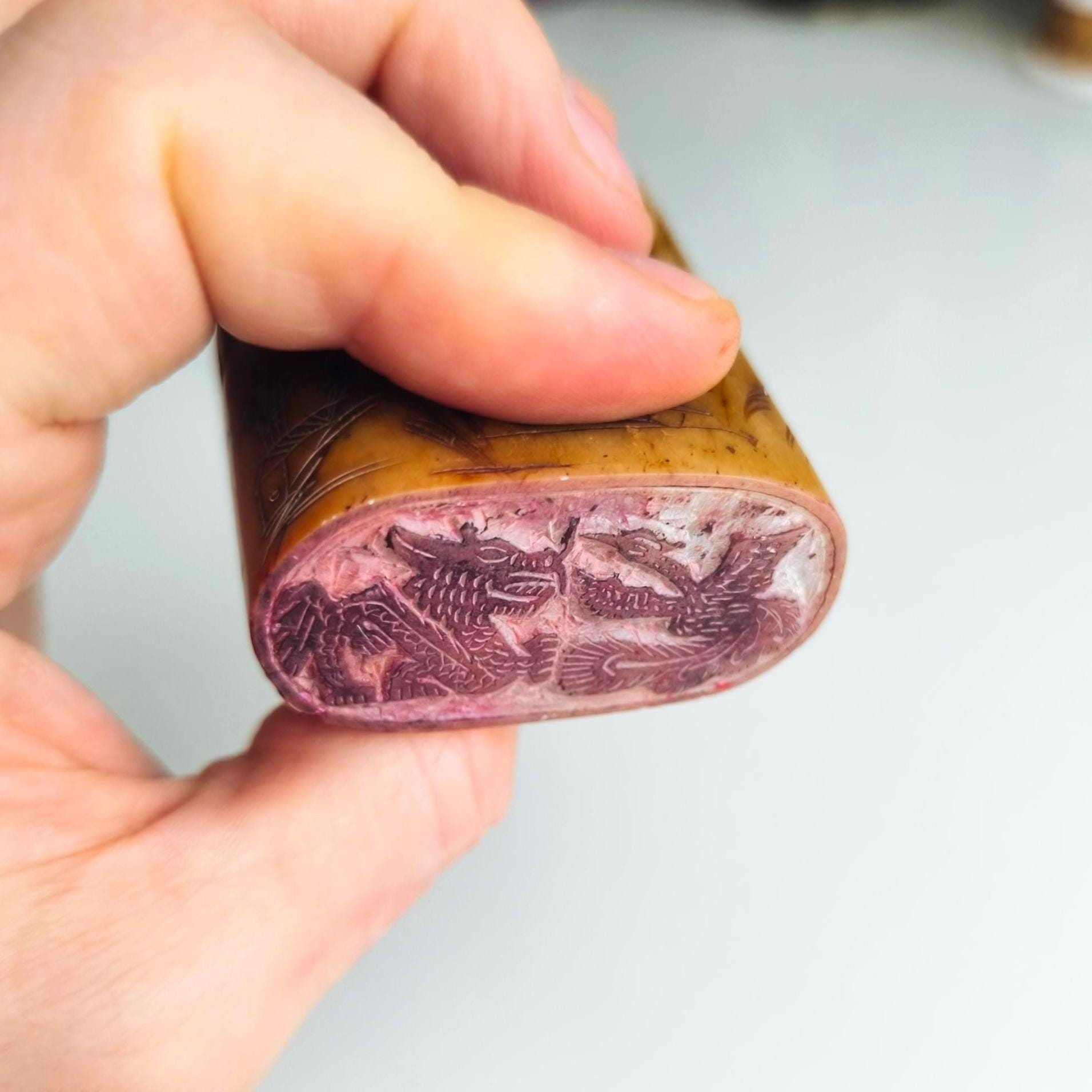 Handmade Brown Stone Sitting Budha Figure Stamp with Dragon and Phoenix, 1970