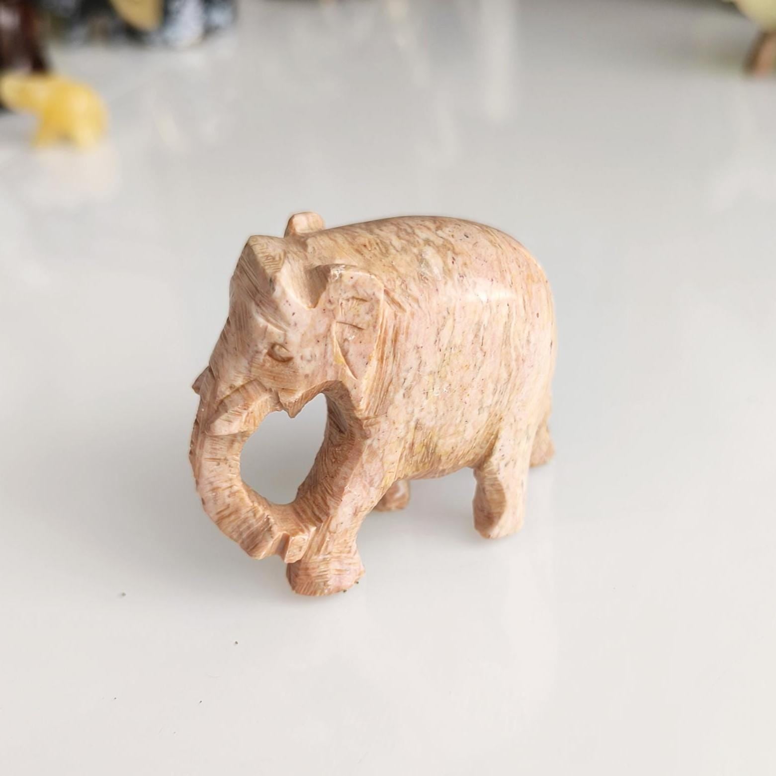 A handmade, Small Asian elephant statue crafted from light brown soapstone. This detailed 2000s piece reflects traditional craftsmanship and cultural artistry. A unique decorative collectible for home or office.