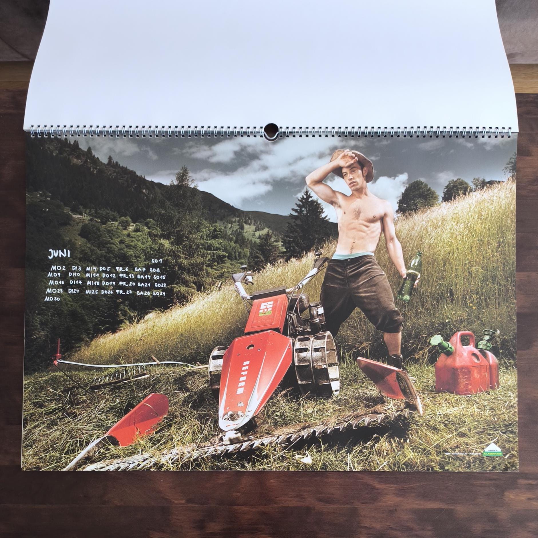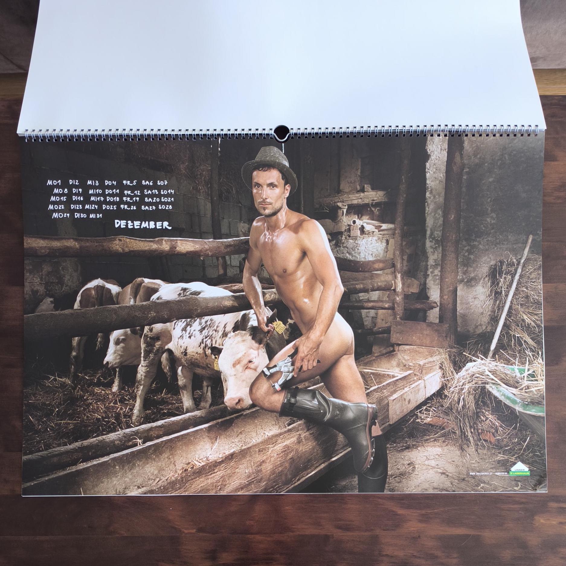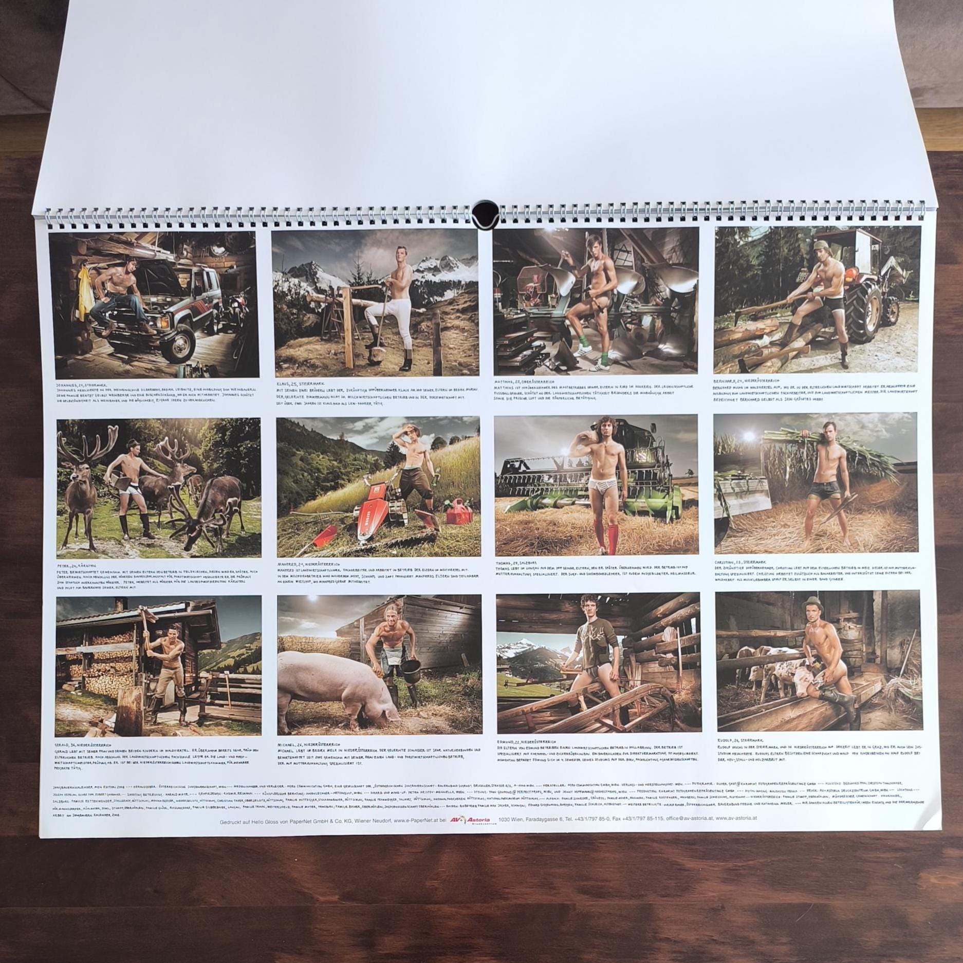 Original photo calendar published by the Austrian Young Farmers Association. The Jungbauernkalender series, issued annually since 2001, features authentic Austrian farmers posed in artistic photographs, celebrating rural life and agriculture. 64cm. / 44 cm.