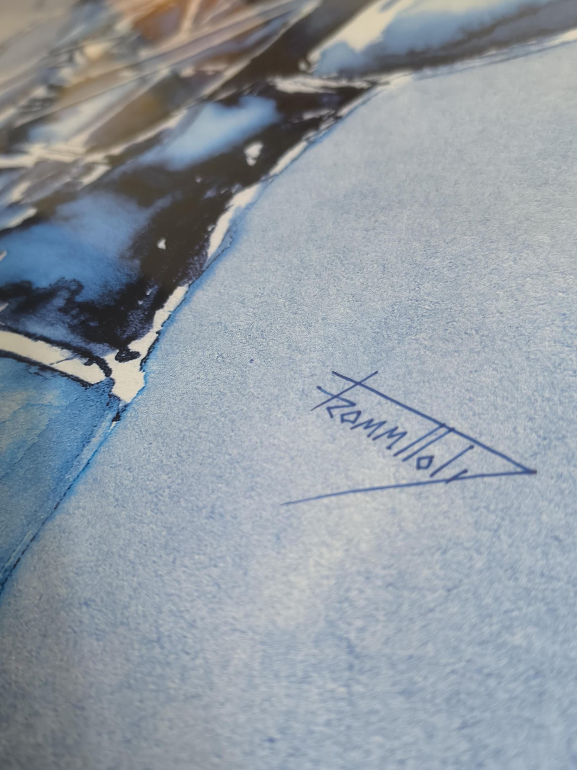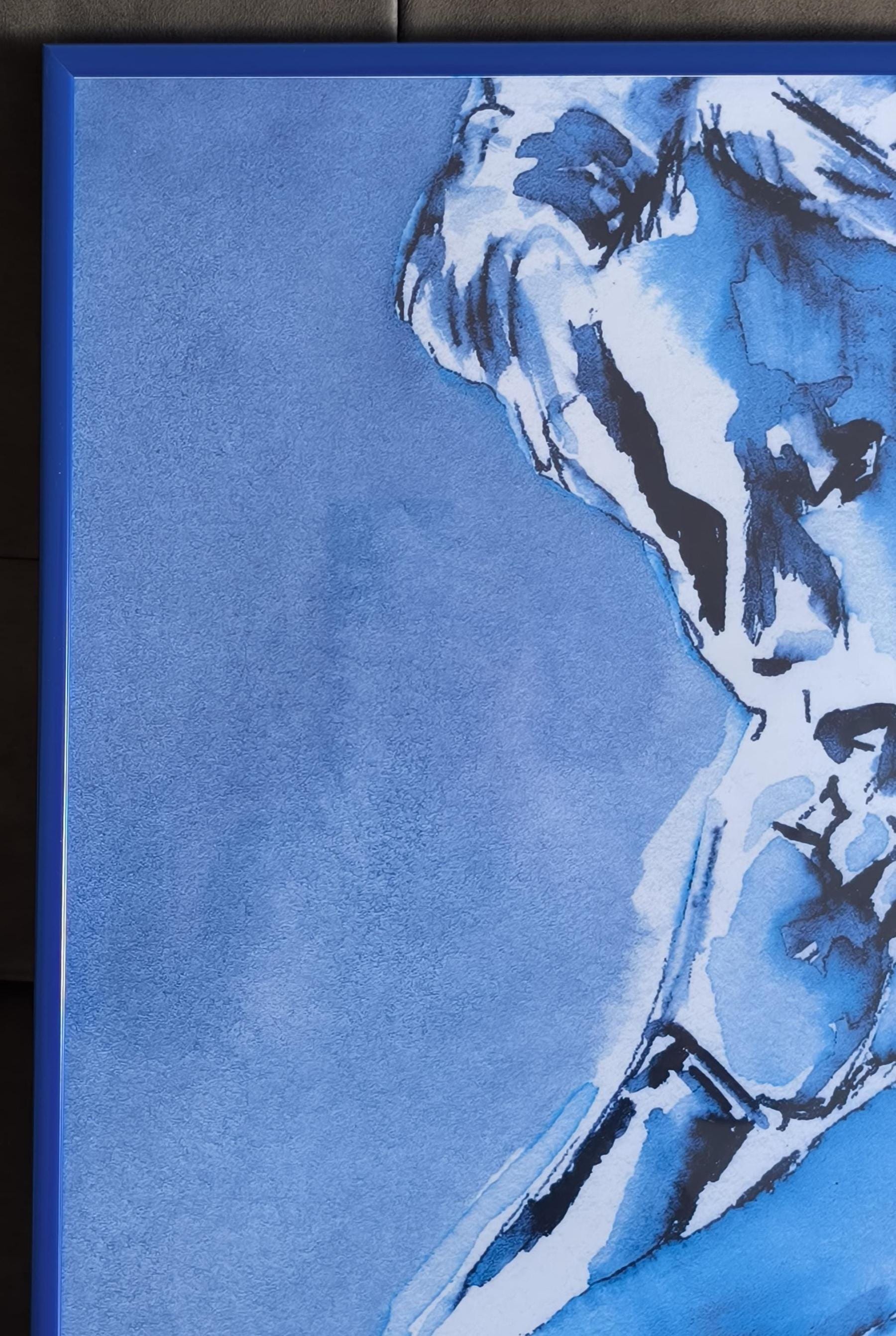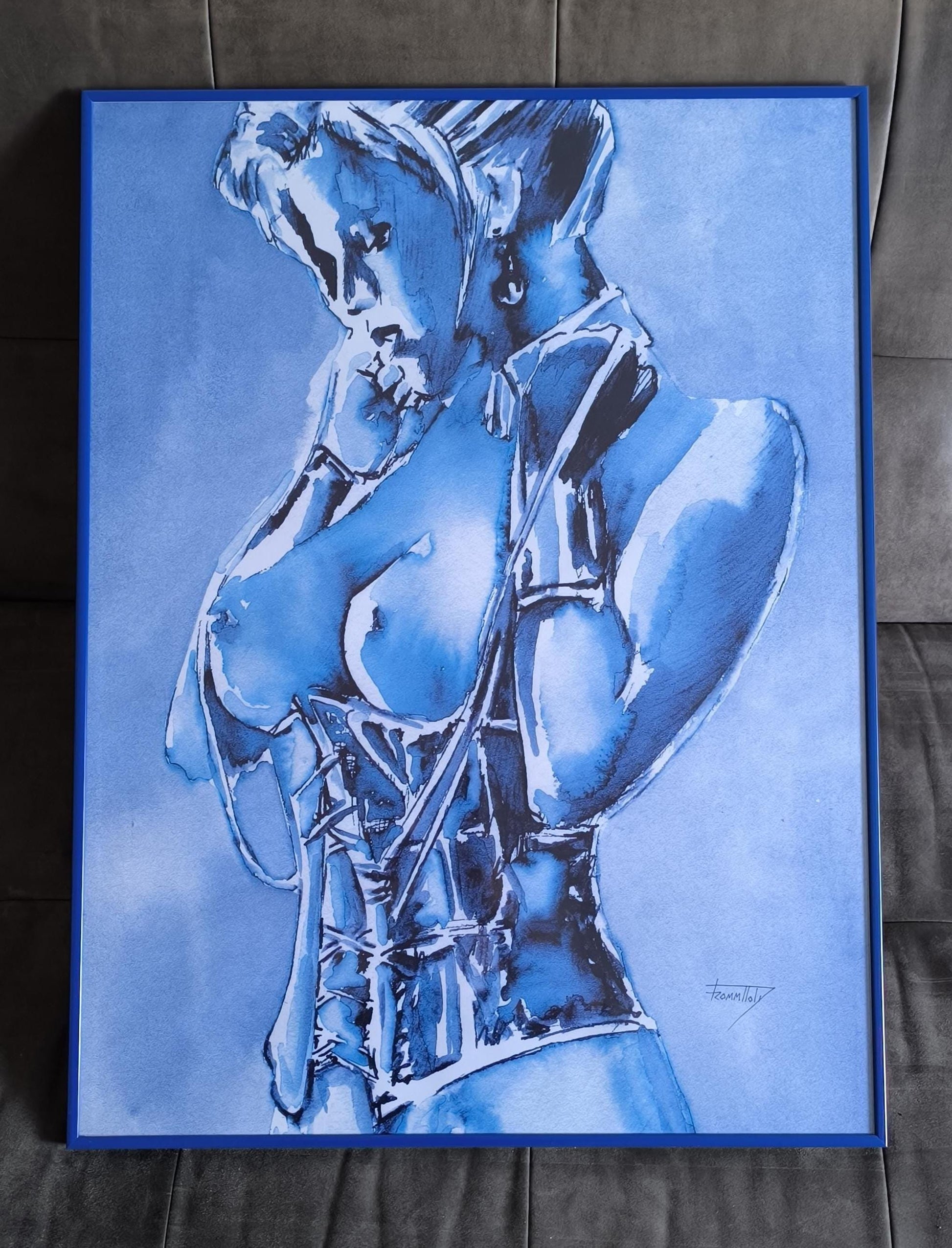 Expressive watercolor painting of a nude female figure by German artist Jürgen Frommhold, created before 1990. Signed by the author and professionally framed (60 × 80 cm). Frommhold is known for his emotionally charged depictions of women, often blending watercolor with graphic techniques and using a restrained color palette.
