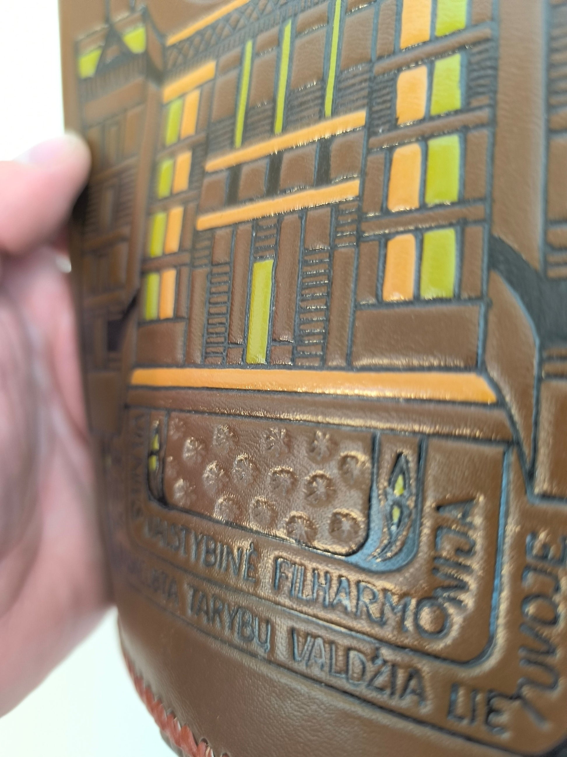 Handcrafted propaganda embossed leather notebook cover featuring a significant Lithuanian inscription from 1918, commemorating the Soviet rule declaration of Vilnius State Philharmonic. Soviet Union era.