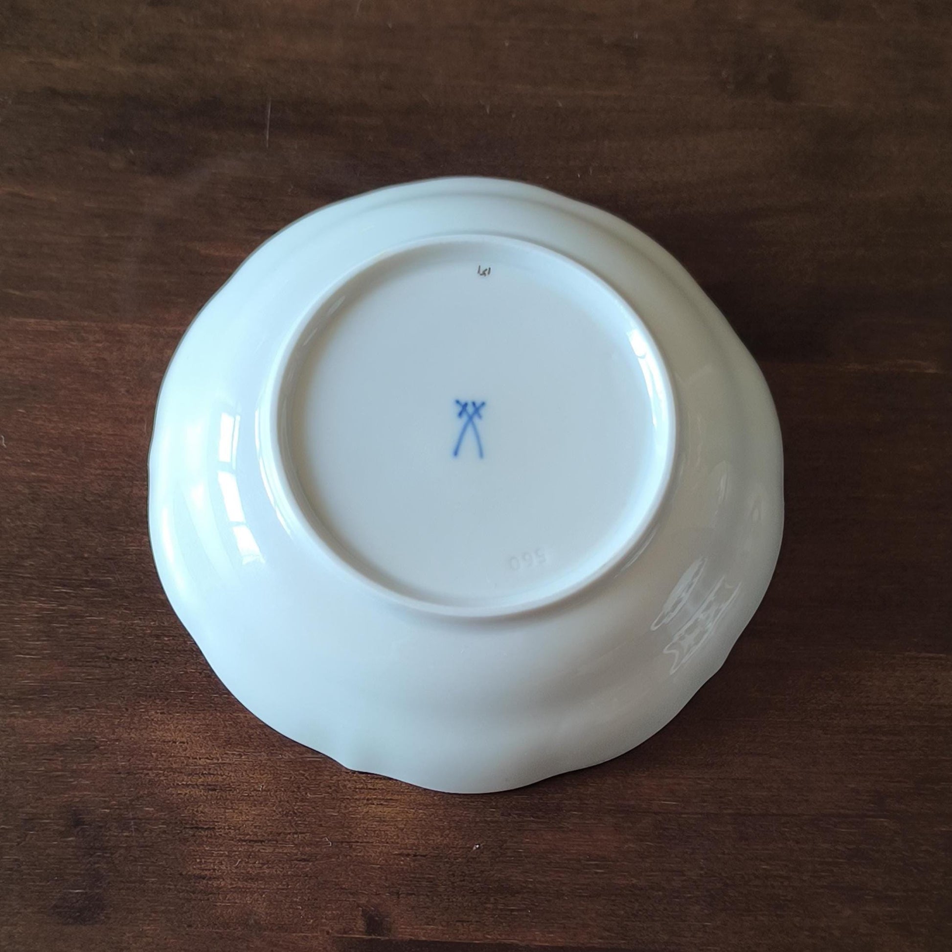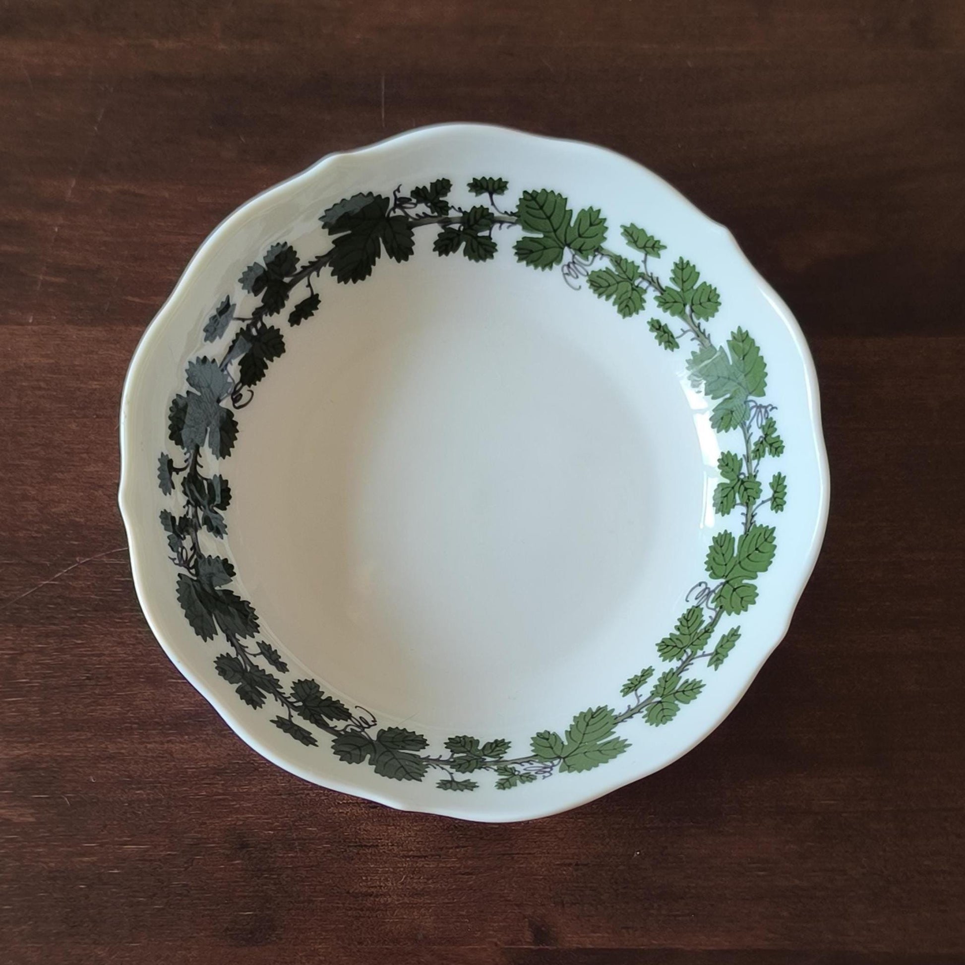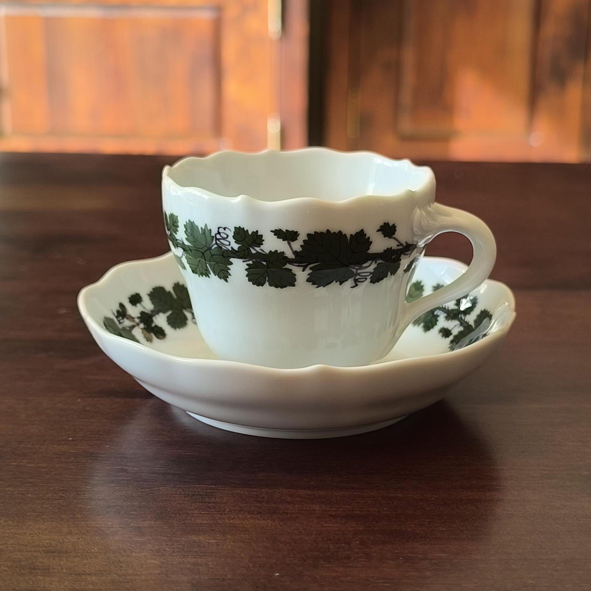 Enhance your table setting with this exquisite Meissen porcelain demitasse set. Featuring a distinctive green vine pattern and scalloped edges, this elegant cup and saucer showcase a characteristic shape with an artful split handle. Handcrafted from the finest white porcelain in Germany, the set exemplifies superb workmanship and timeless design. Perfect for collectors and those who appreciate refined tableware.