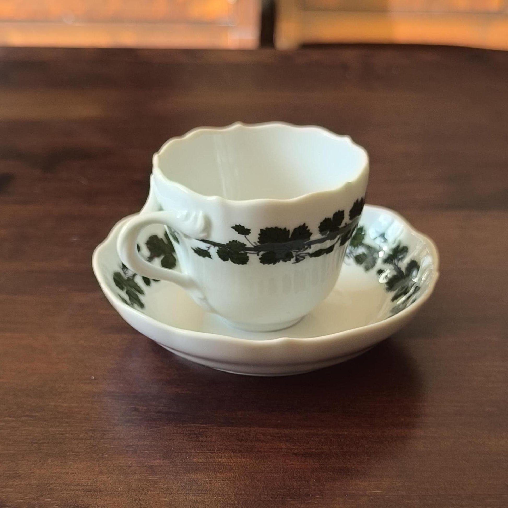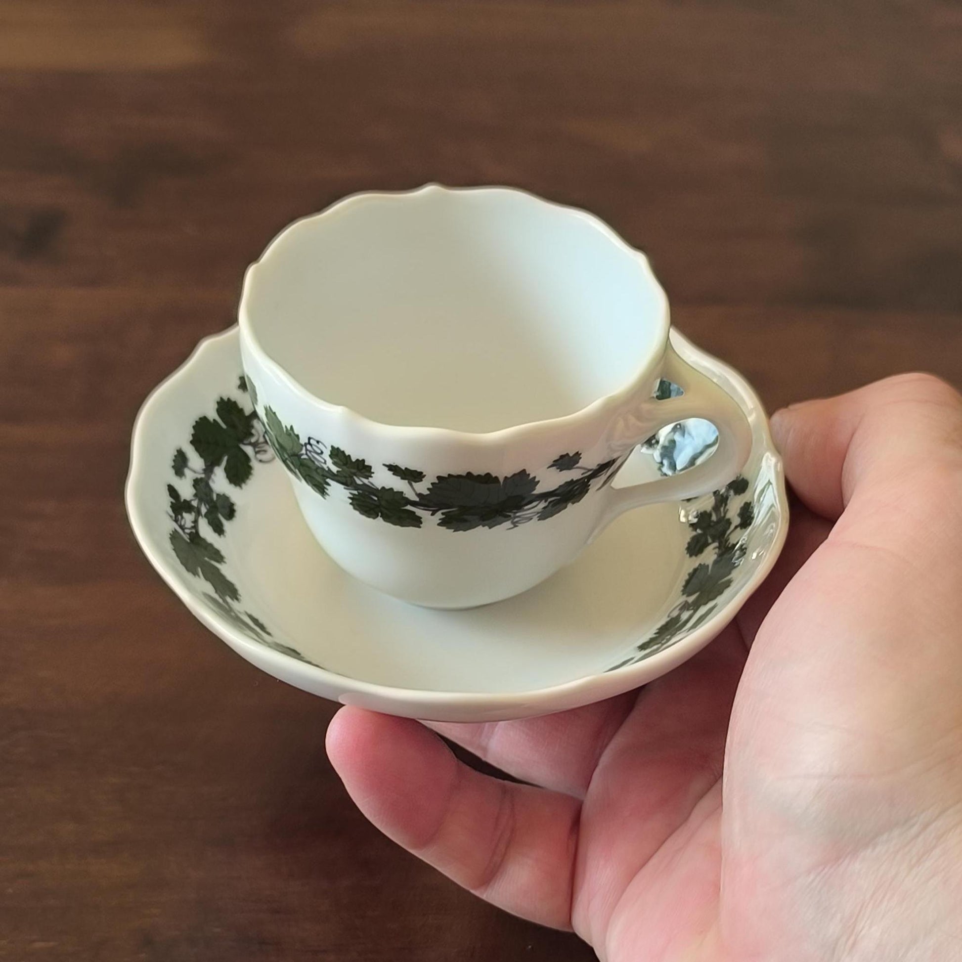 Meissen Porcelain Demitasse Set Espresso/Tea Cup & Saucer Green Vine Pattern with Scalloped Edge