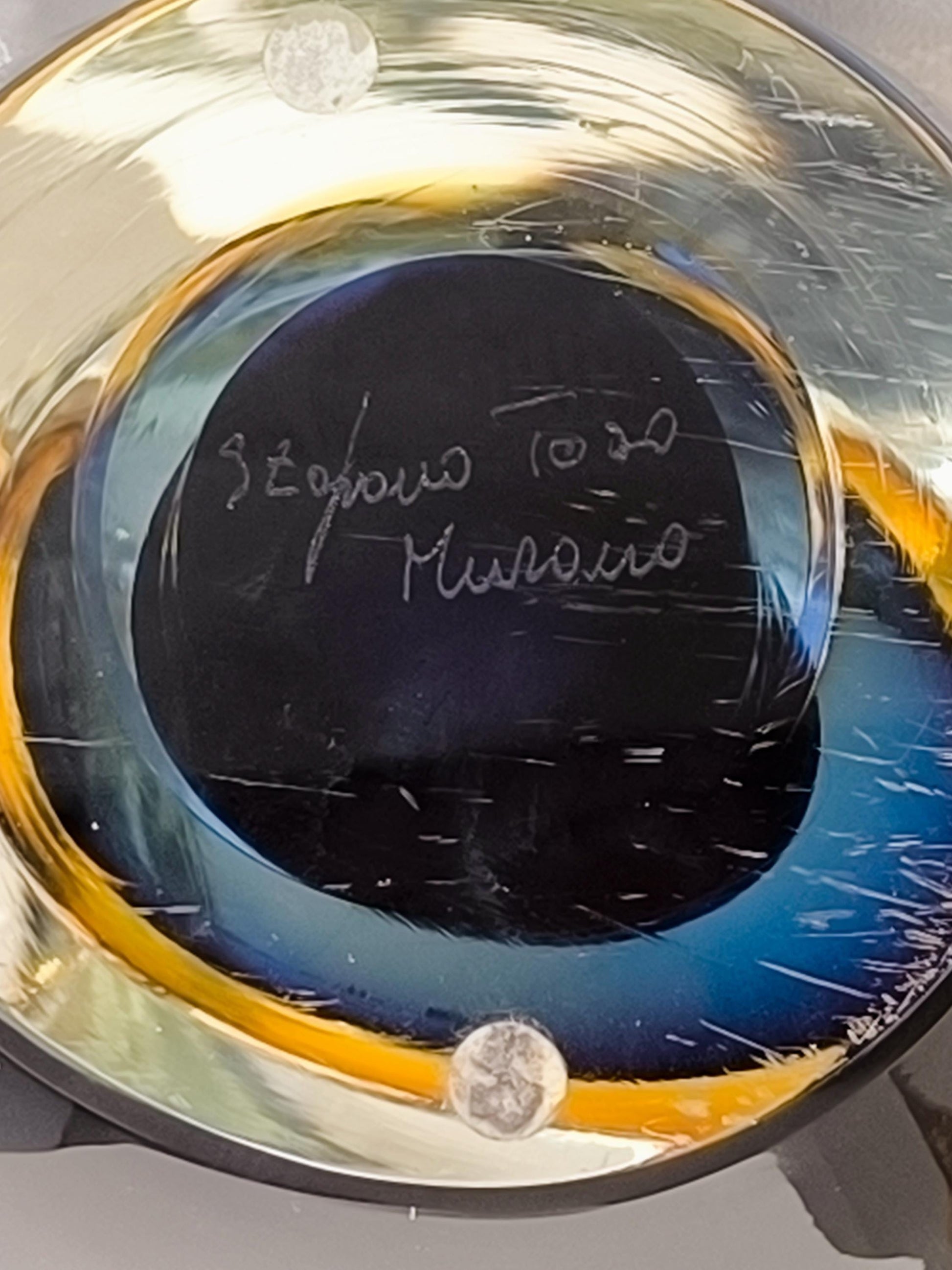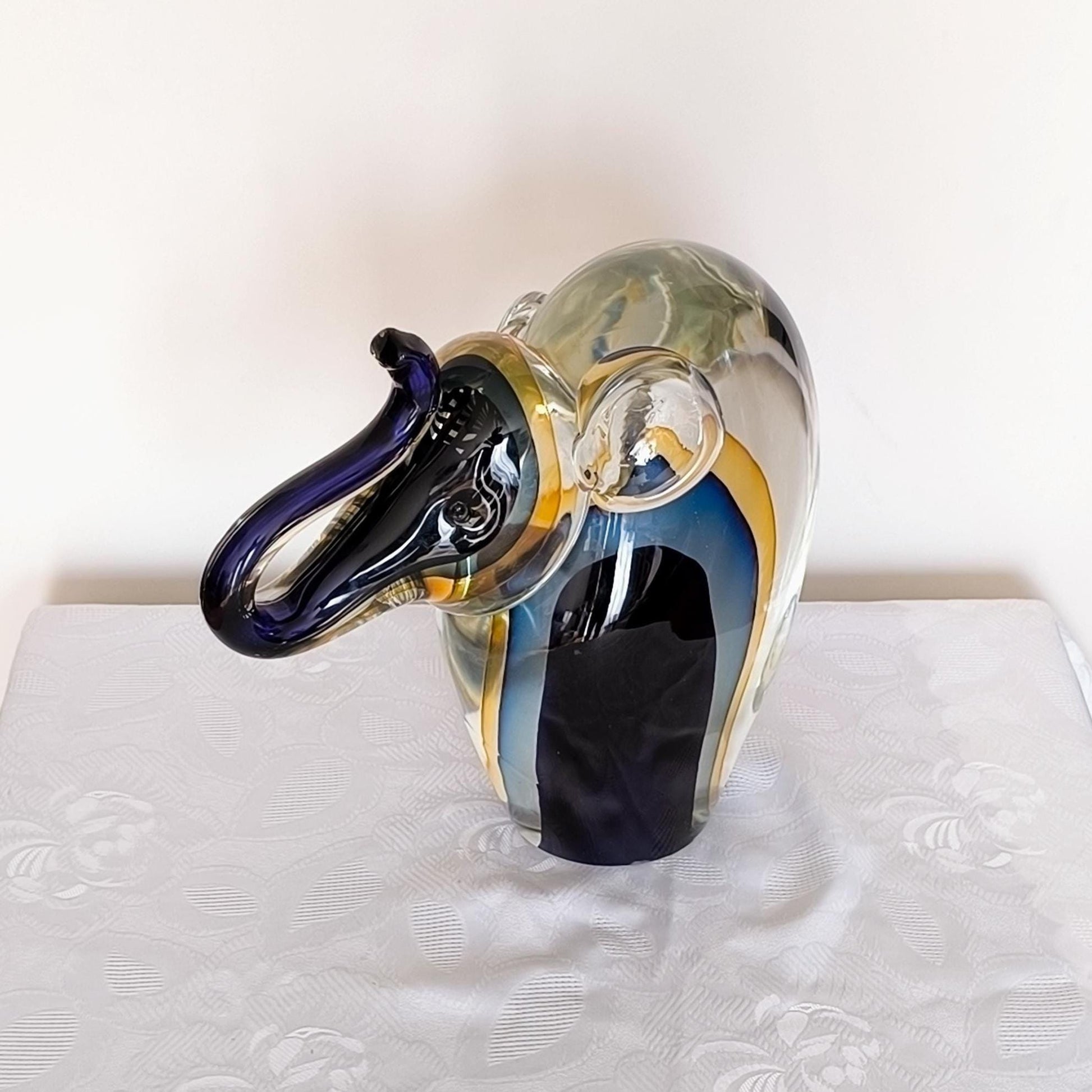 Original Murano art glass elephant sculpture handcrafted and signed by Maestro Stefano Toso in Italy during the 1960s. This vintage piece features rich layered colors in amber, cobalt, and clear glass, expertly formed into an abstract elephant figure. A striking example of mid-century Murano craftsmanship, standing 31 cm tall and 23 cm wide. A collectible statement piece signed by the artist and created using traditional Murano techniques.
