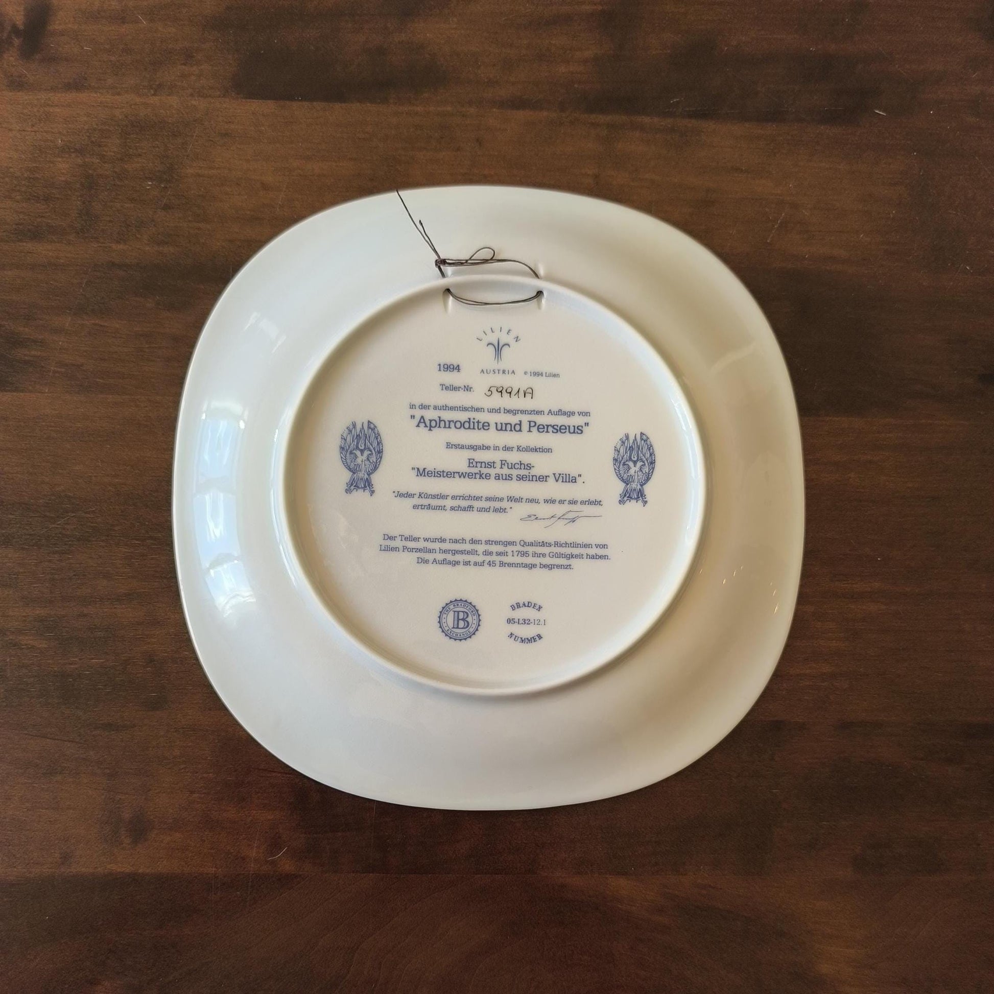 Collector’s wall plate titled "Aphrodite and Perseus" by renowned Austrian artist Ernst Fuchs, part of the 1994 limited edition series "Masterpieces from His Villa". Produced by Lilien Porzellan Salzburg, this square porcelain plate (21 x 21 cm) is marked No. 5991A and comes in new condition with a certificate of authenticity. A fine example of Austrian collectible porcelain art.