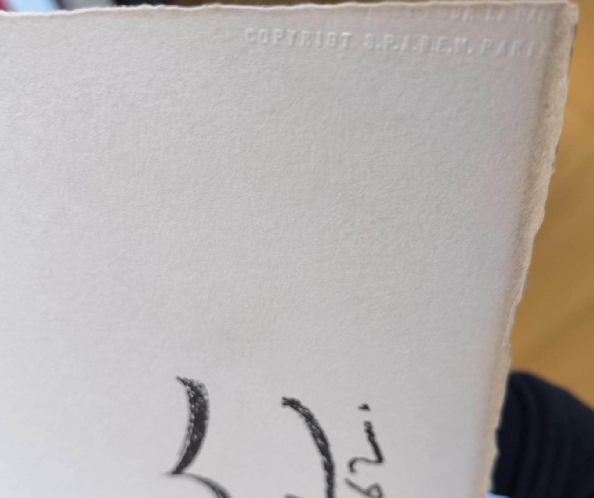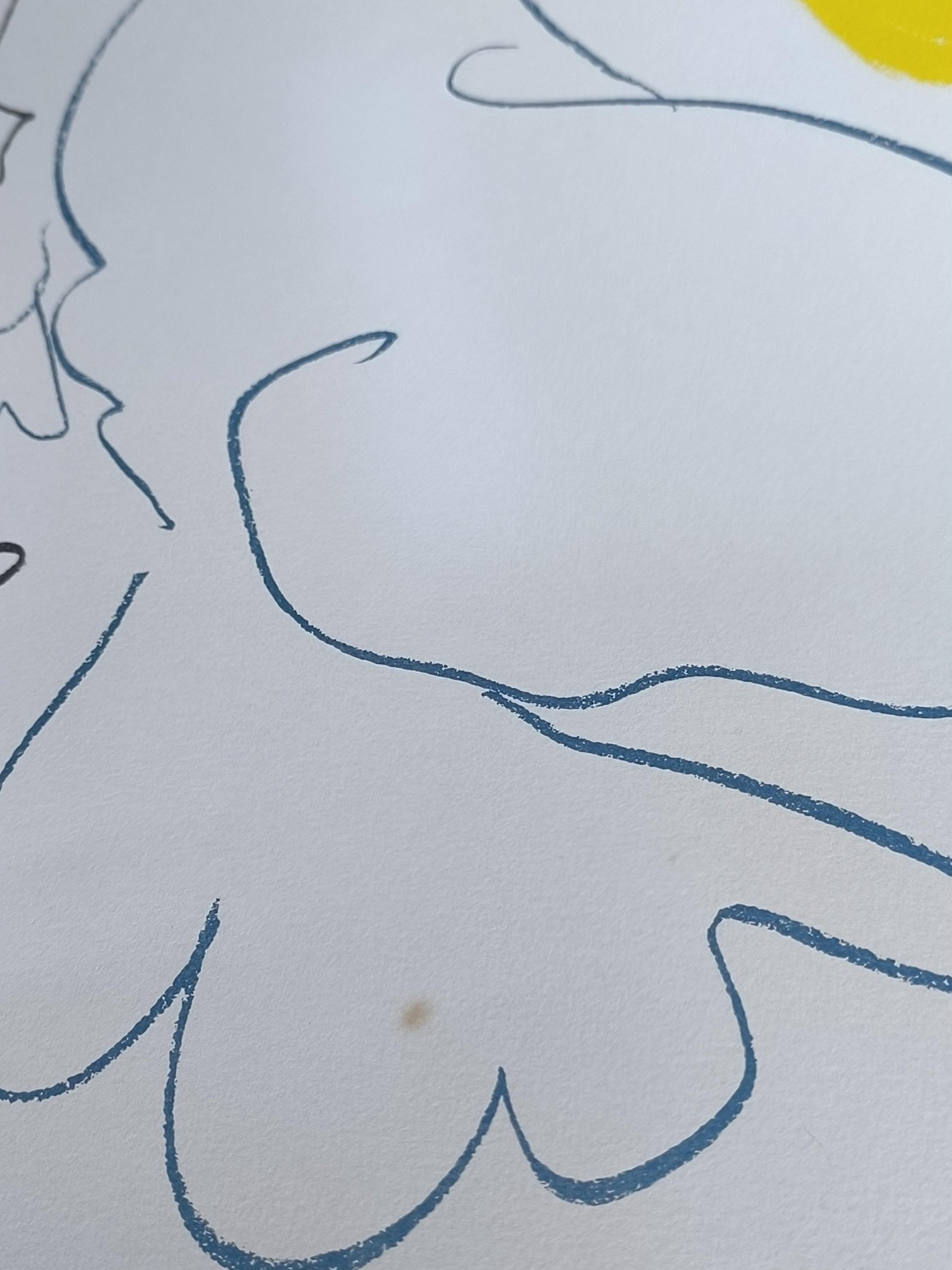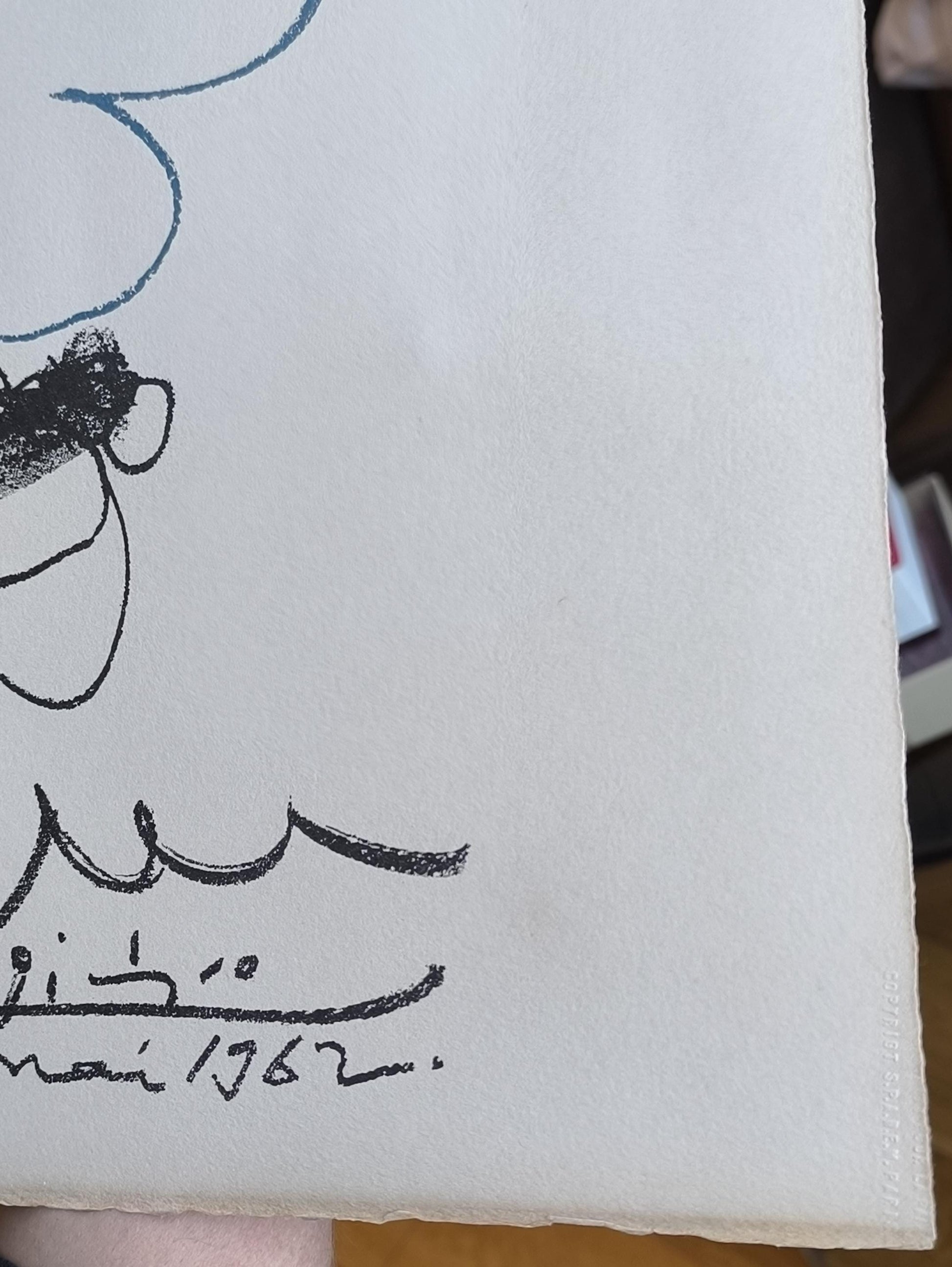 Original lithograph by Pablo Picasso, titled "Dove of Peace", dated May 10, 1962, showing a dove carrying an olive branch while flying over broken weapons—a powerful symbol of hope and peace. This authentic print is signed, printed on original paper, and marked with Copyright S.P.A.D.E.M. Paris. Framed in a high-quality display (size: 60 x 80 cm), it stands as a moving and collectible example of Picasso’s commitment to peace through art.