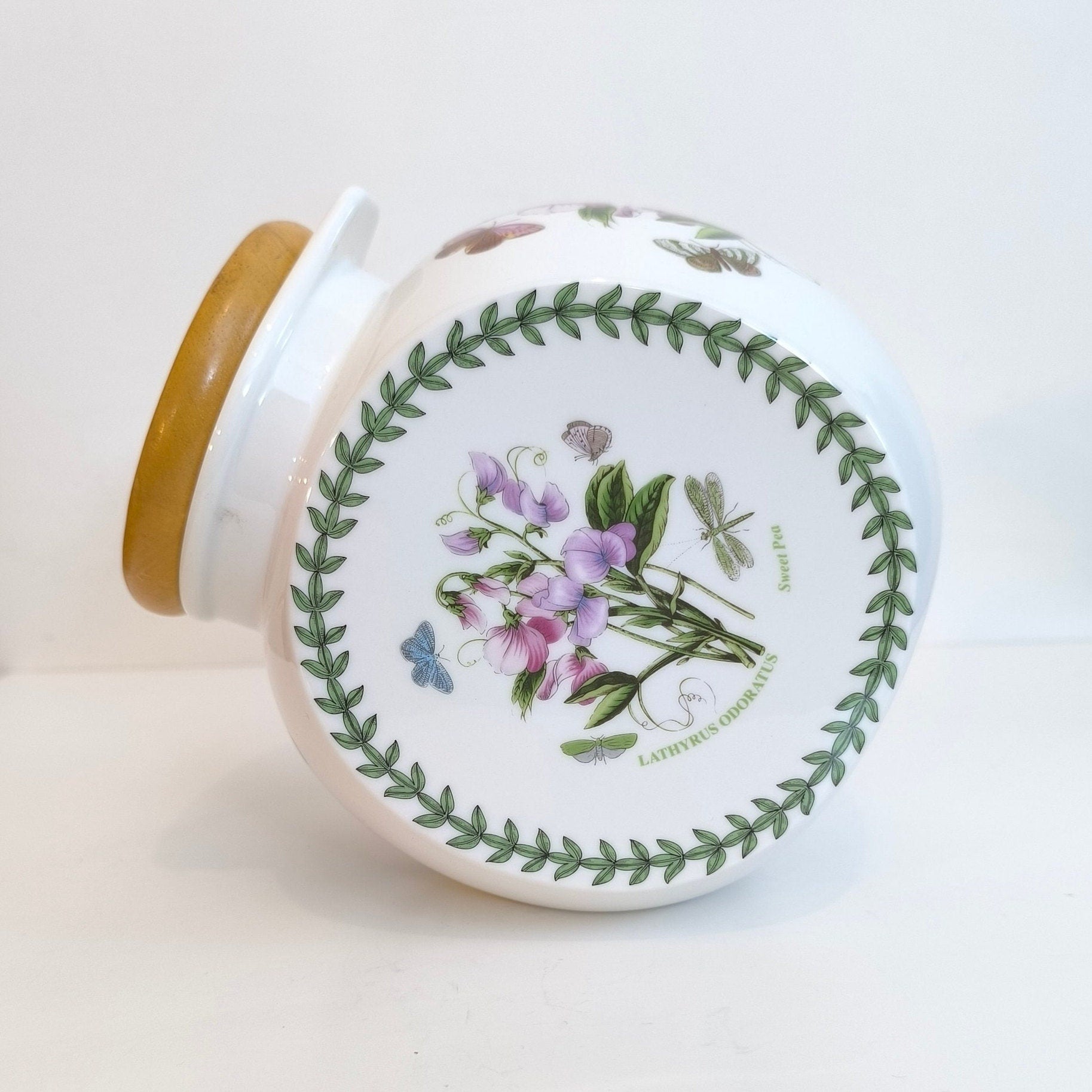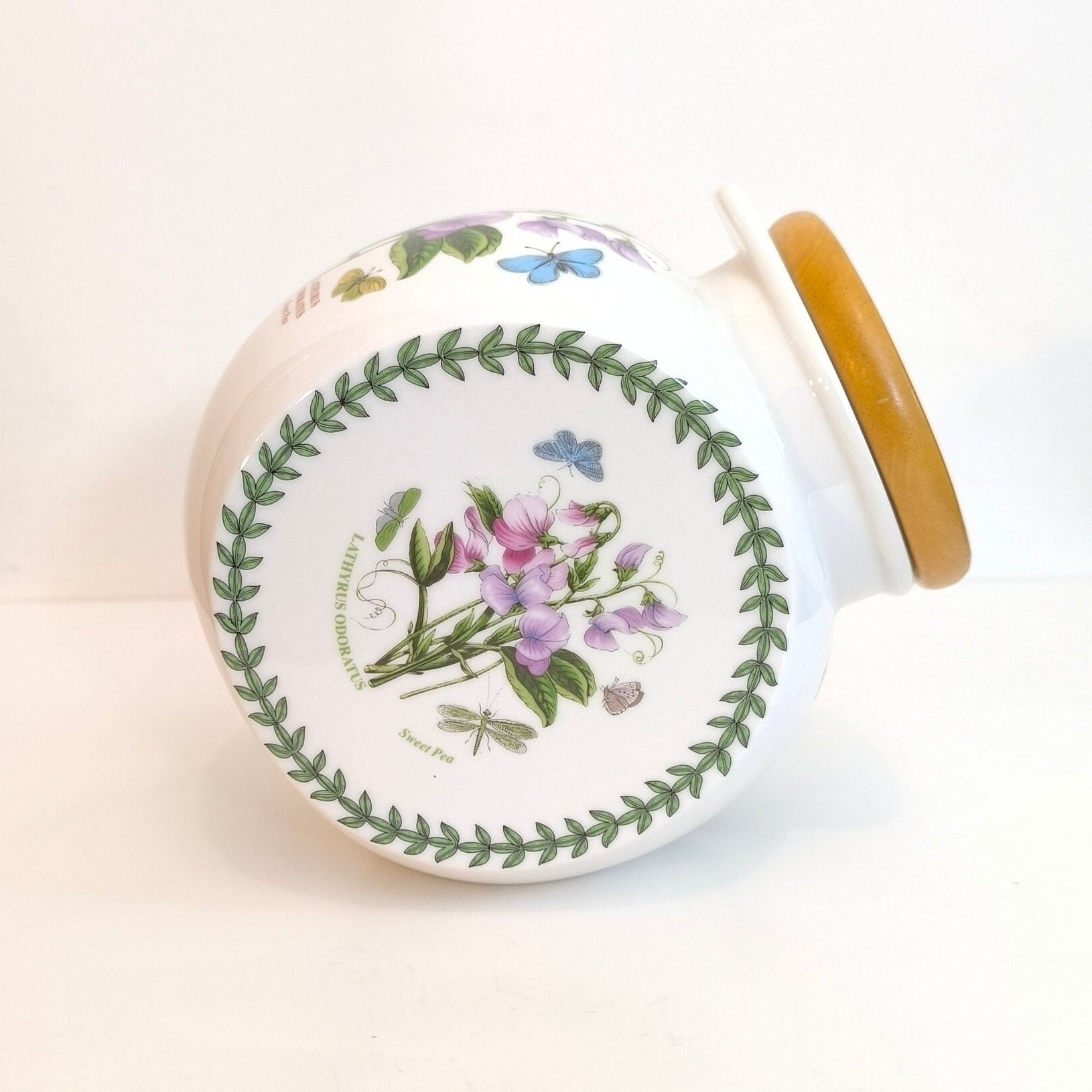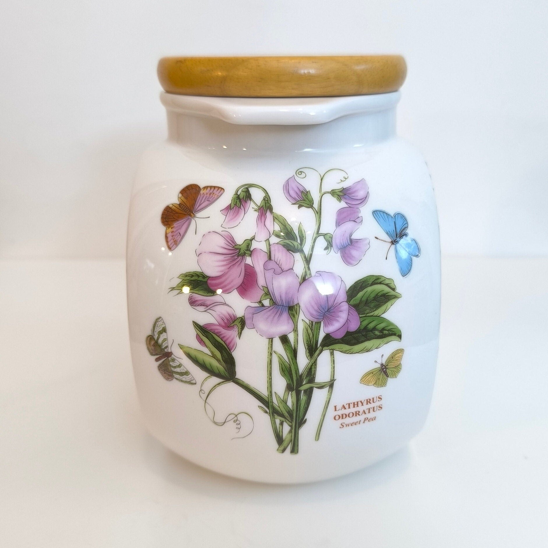 Portmeirion Botanic Garden Sweet Pea Cookie Jar or Canister with Wooden Lid, Lathyrus Odoratus Sweet Pea Butterflies Scientific Illustration