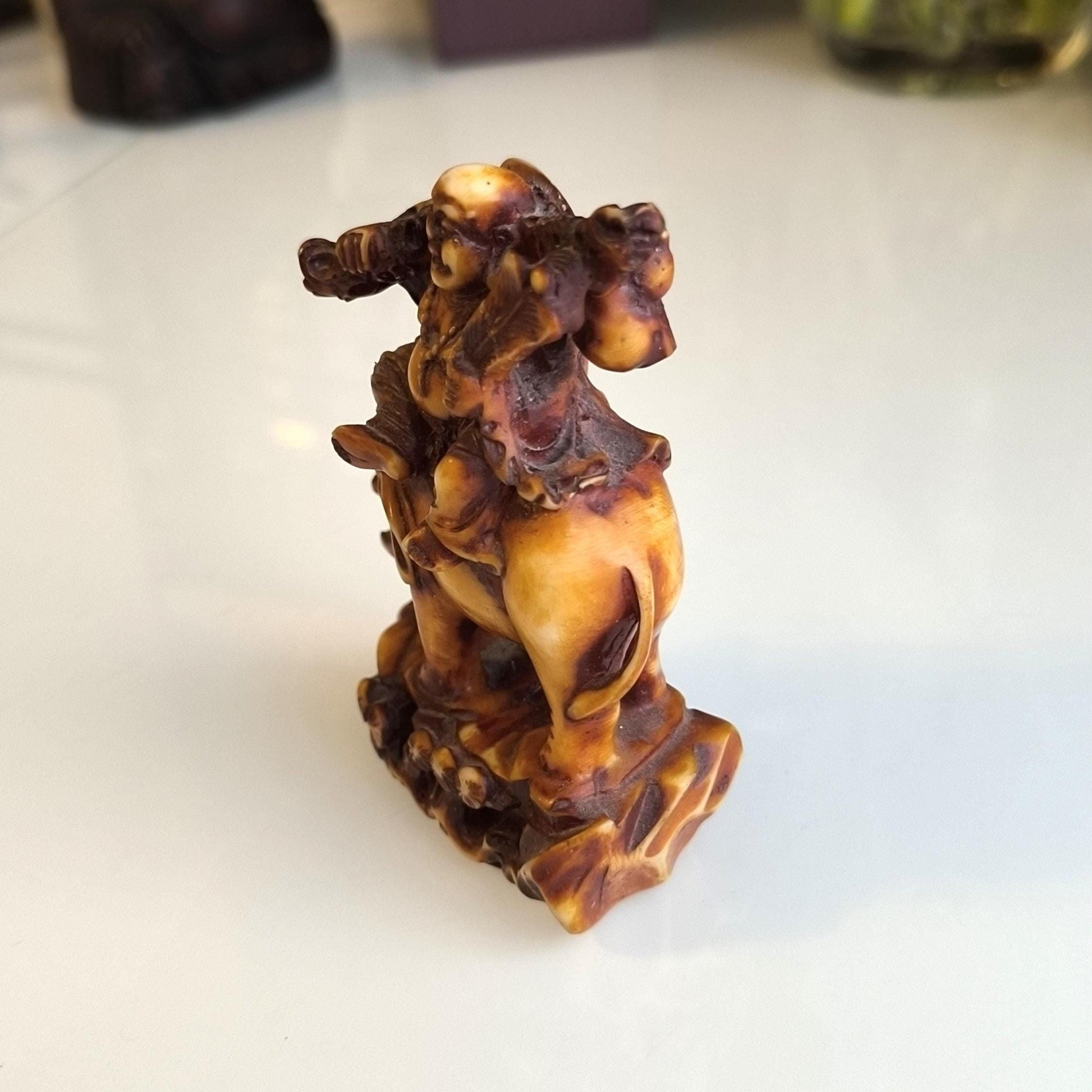 1970 brown resin statuette of a smiling Buddha sitting on an elephant. Decorative and symbolic spiritual figure.
