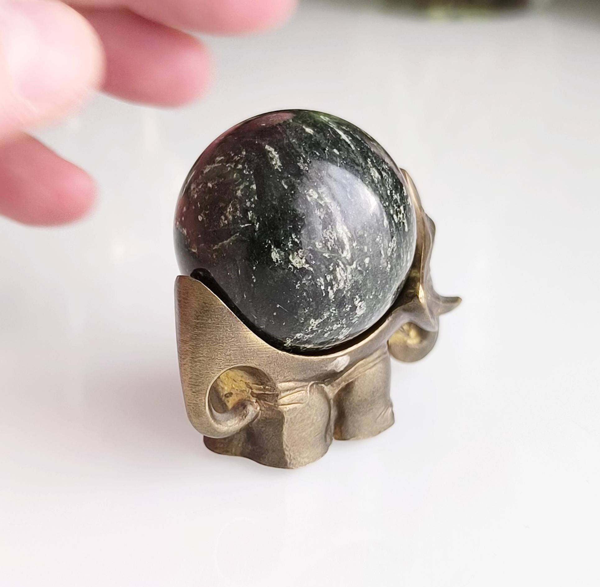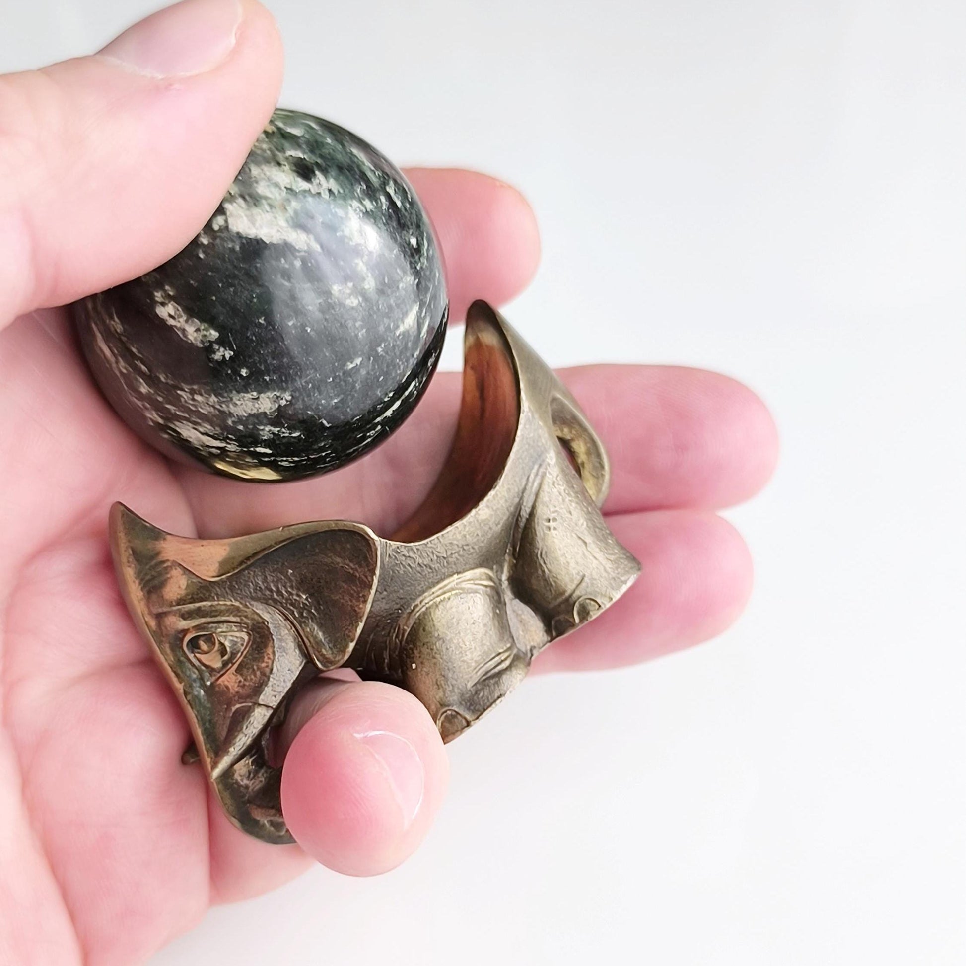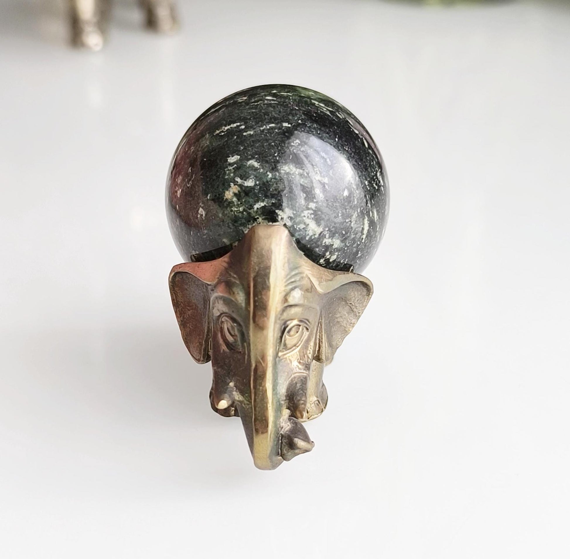 A finely crafted small bronze statue of an Asian elephant, featuring an esoteric black round stone that protrudes from its body. This unique piece embodies spiritual symbolism and artistic craftsmanship, making it a perfect addition to altars, meditation spaces, or esoteric collections. Dating back to the 1980s, it showcases the mysticism and cultural significance of the elephant in Asian traditions.