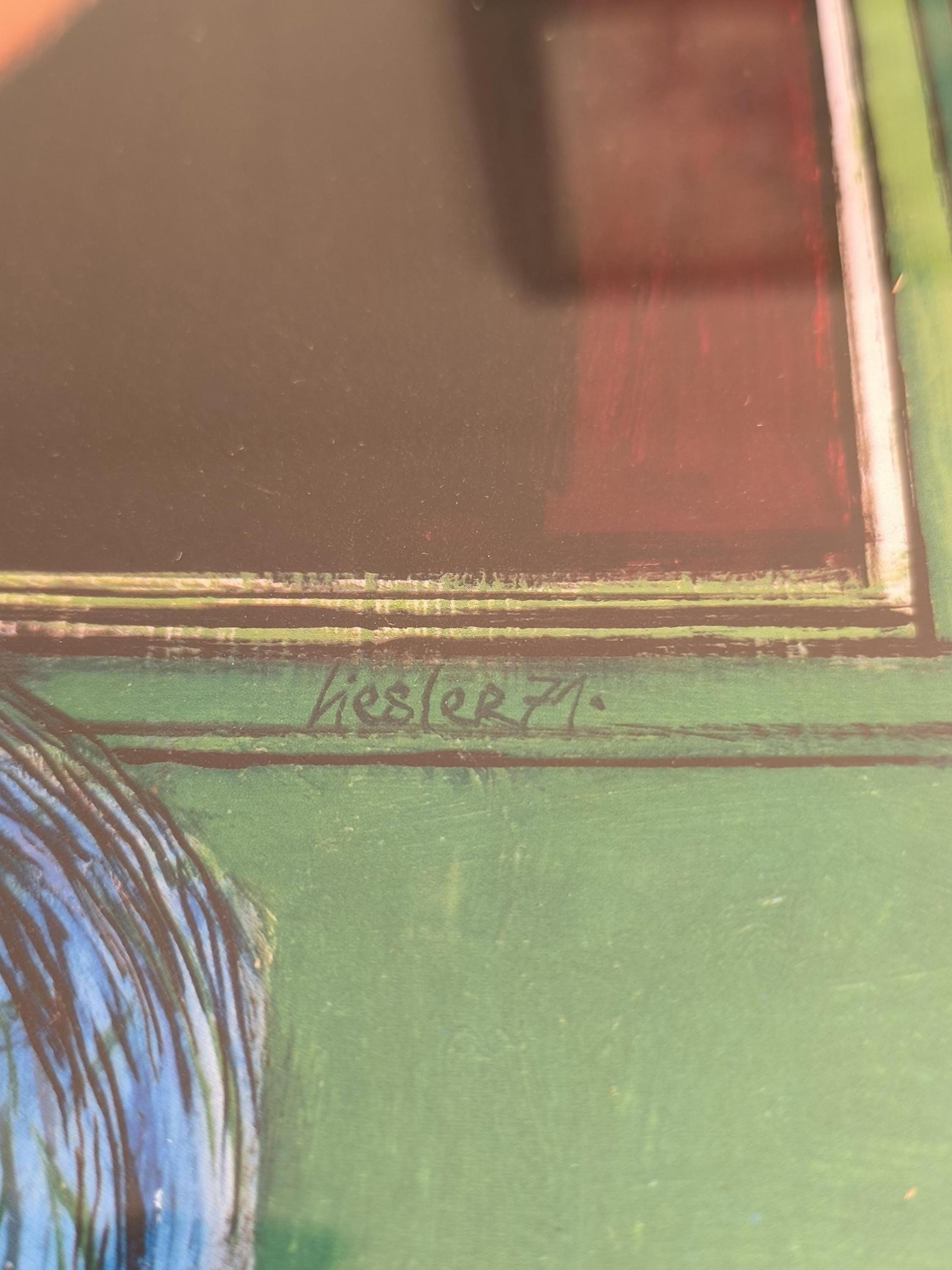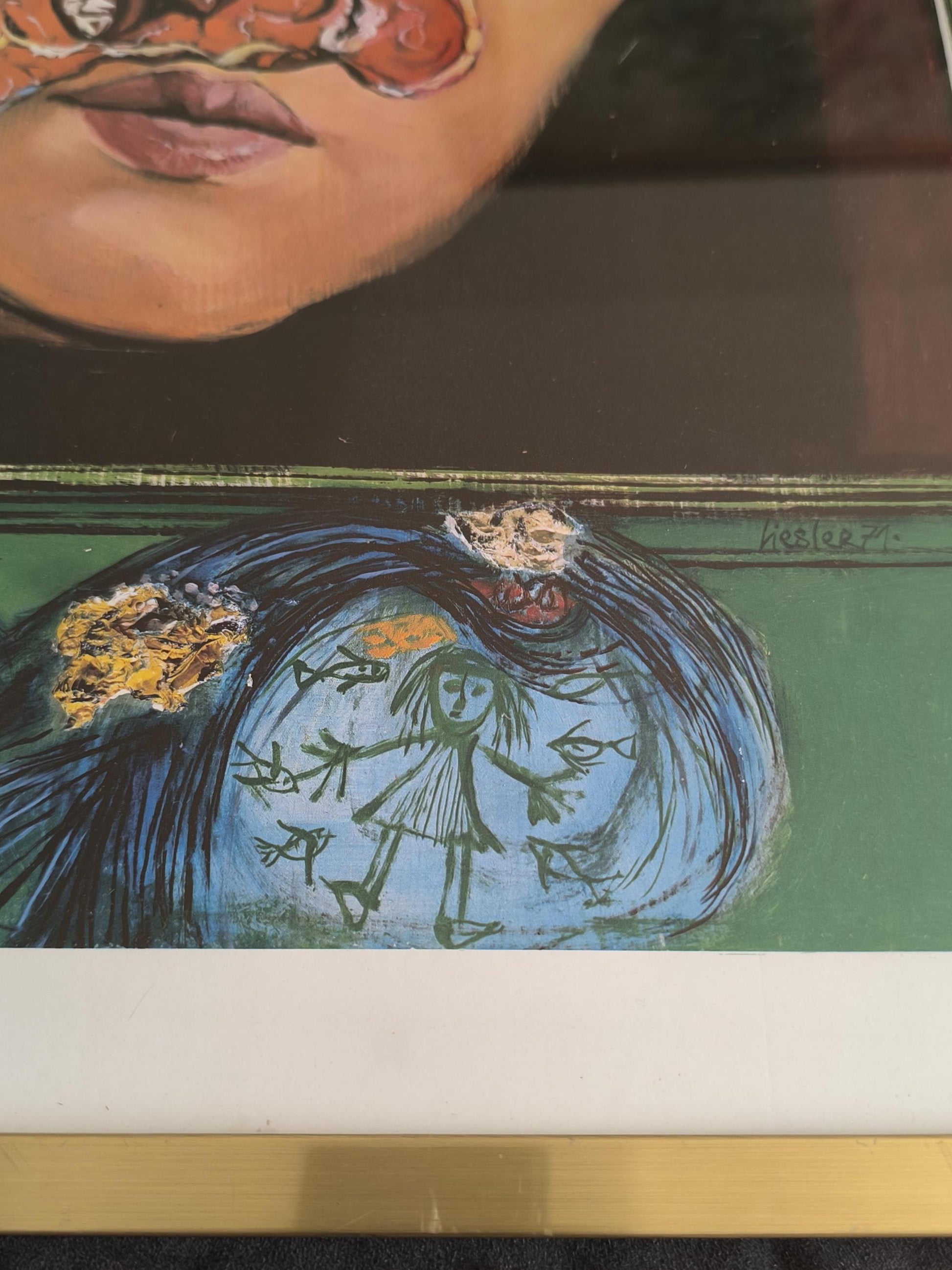 Original etching on cardboard by renowned Czech surrealist Josef Liesler (1912–2005), created in 1971 and signed by the artist. The surreal composition features a stylized female face surrounded by fantastical elements, eyes, and symbolism. Framed, dimensions 52 × 54 cm.