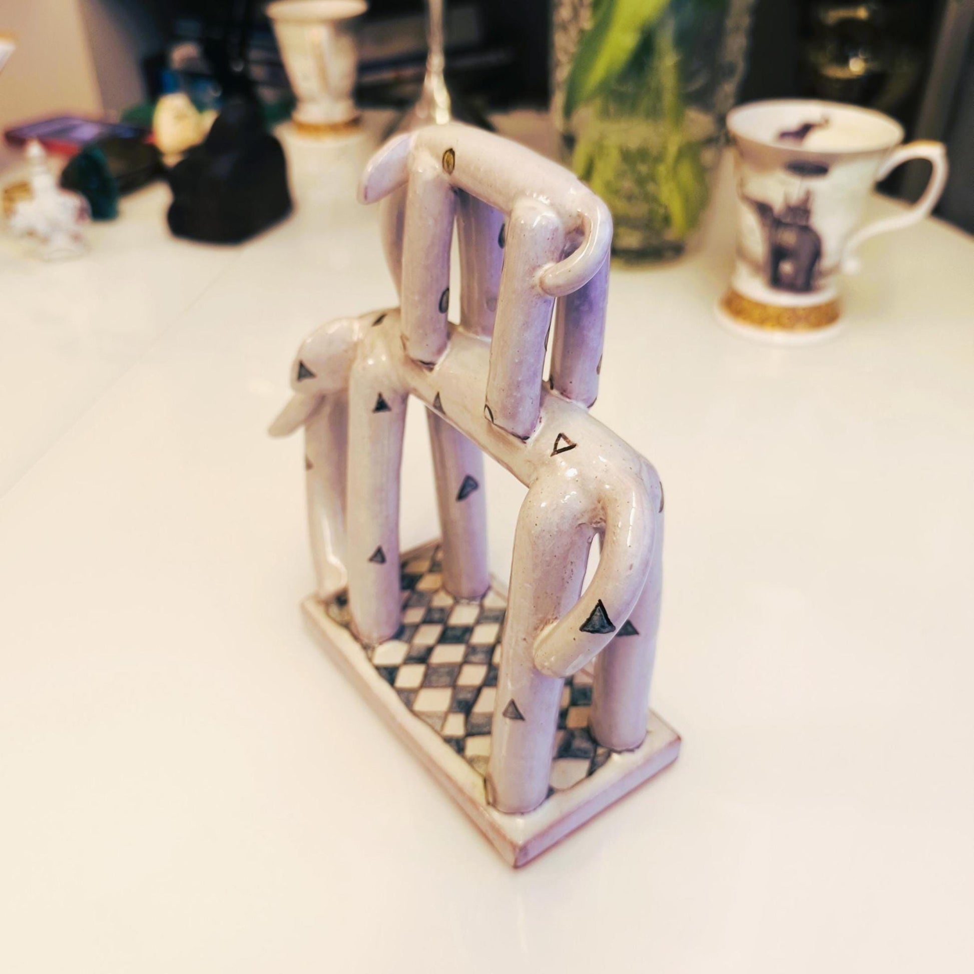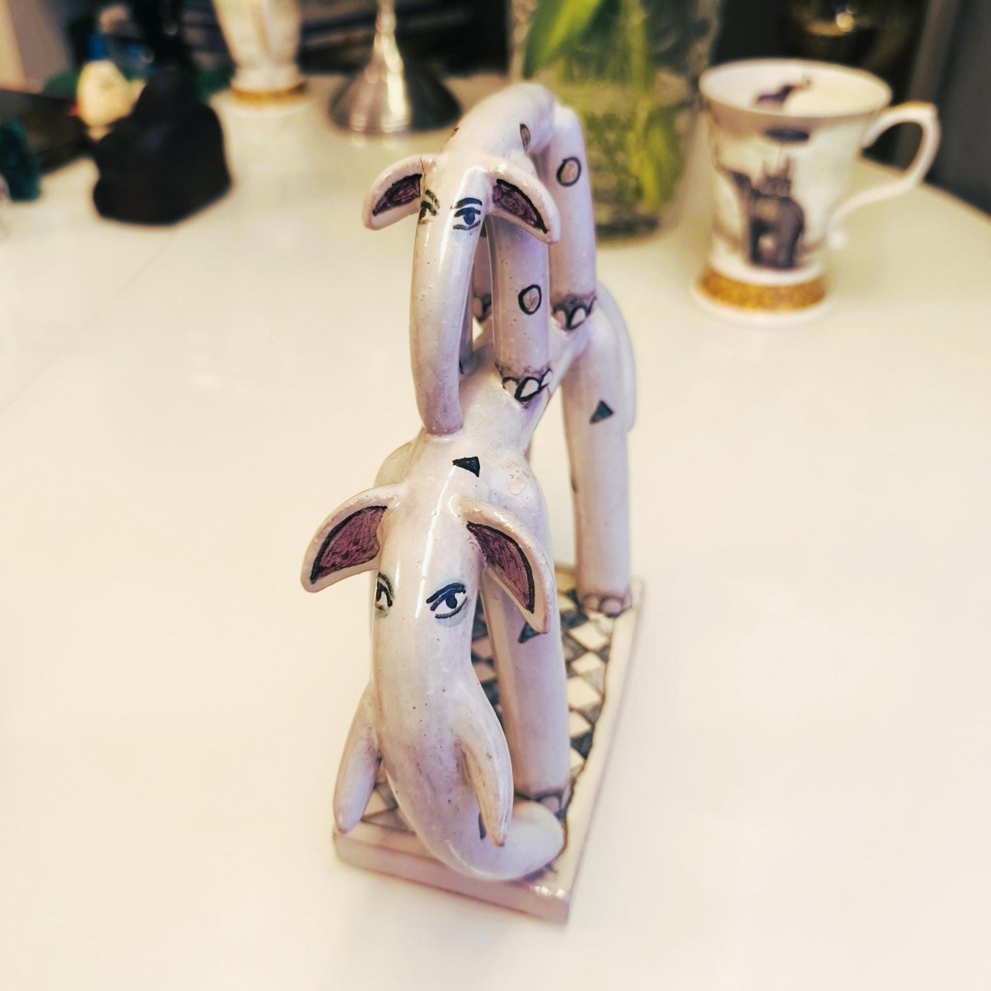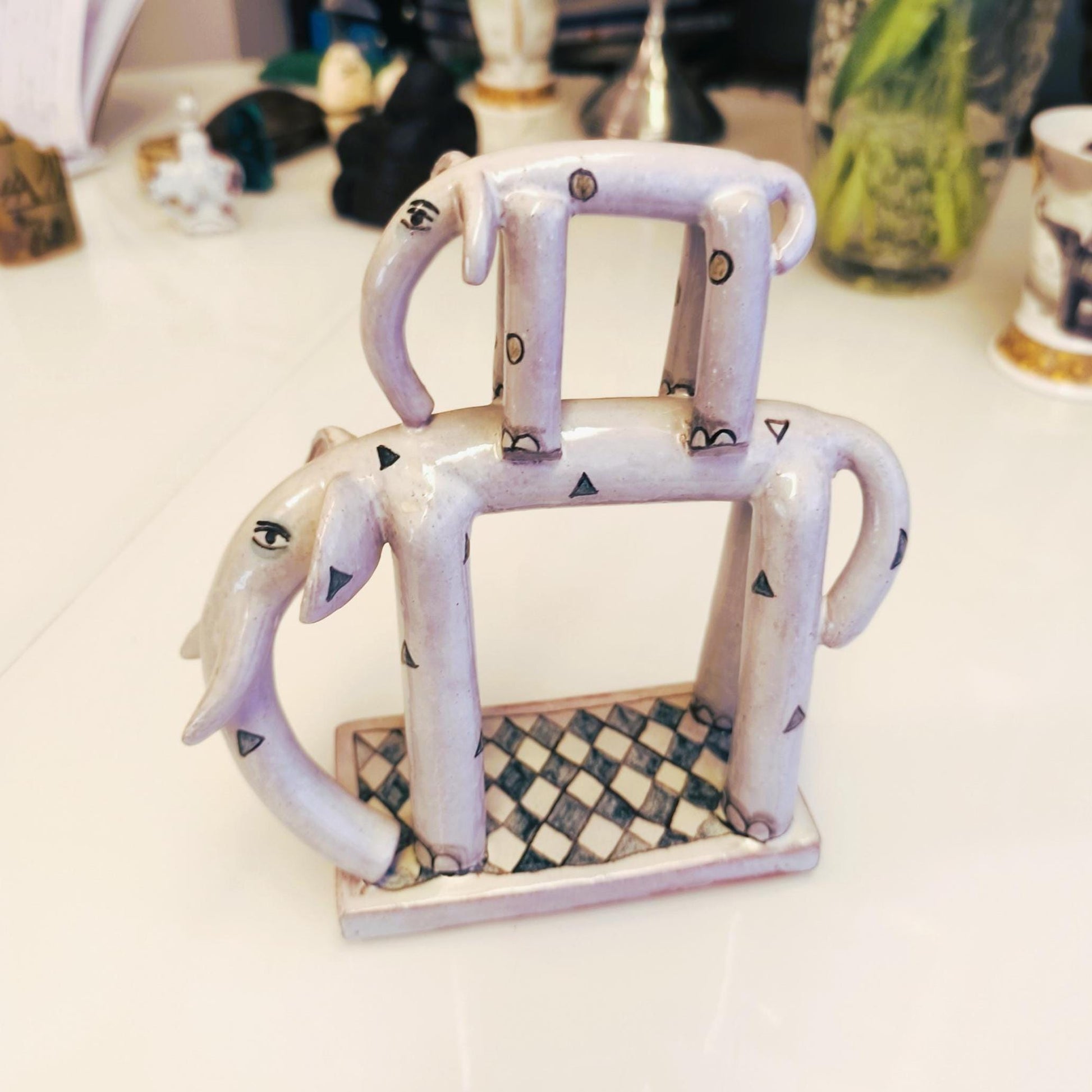 Handmade ceramic sculpture of two gray glazed elephants stacked on a painted rhombus base. Decorative ornaments: triangles on the larger elephant, circles on the smaller. Made circa 1970.
