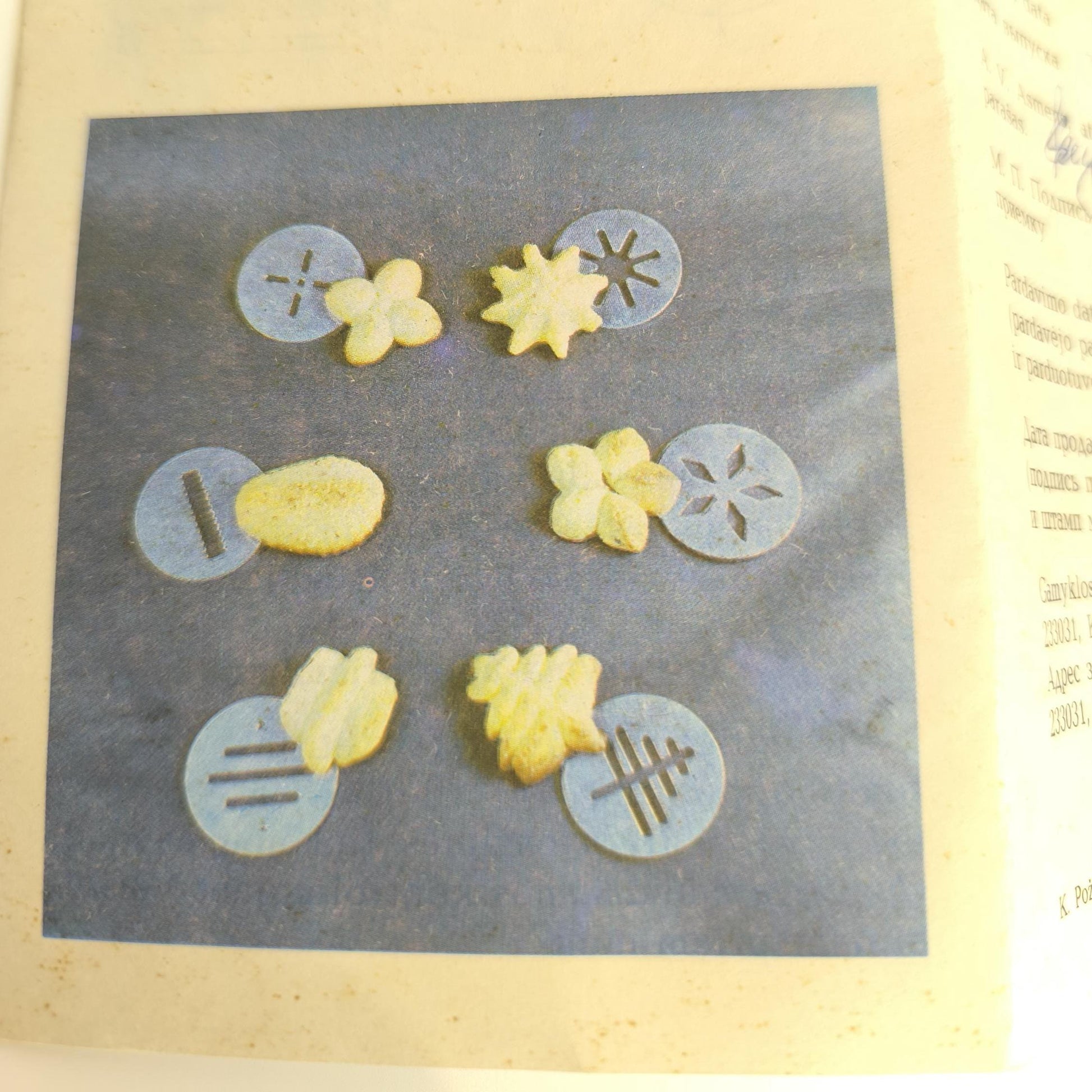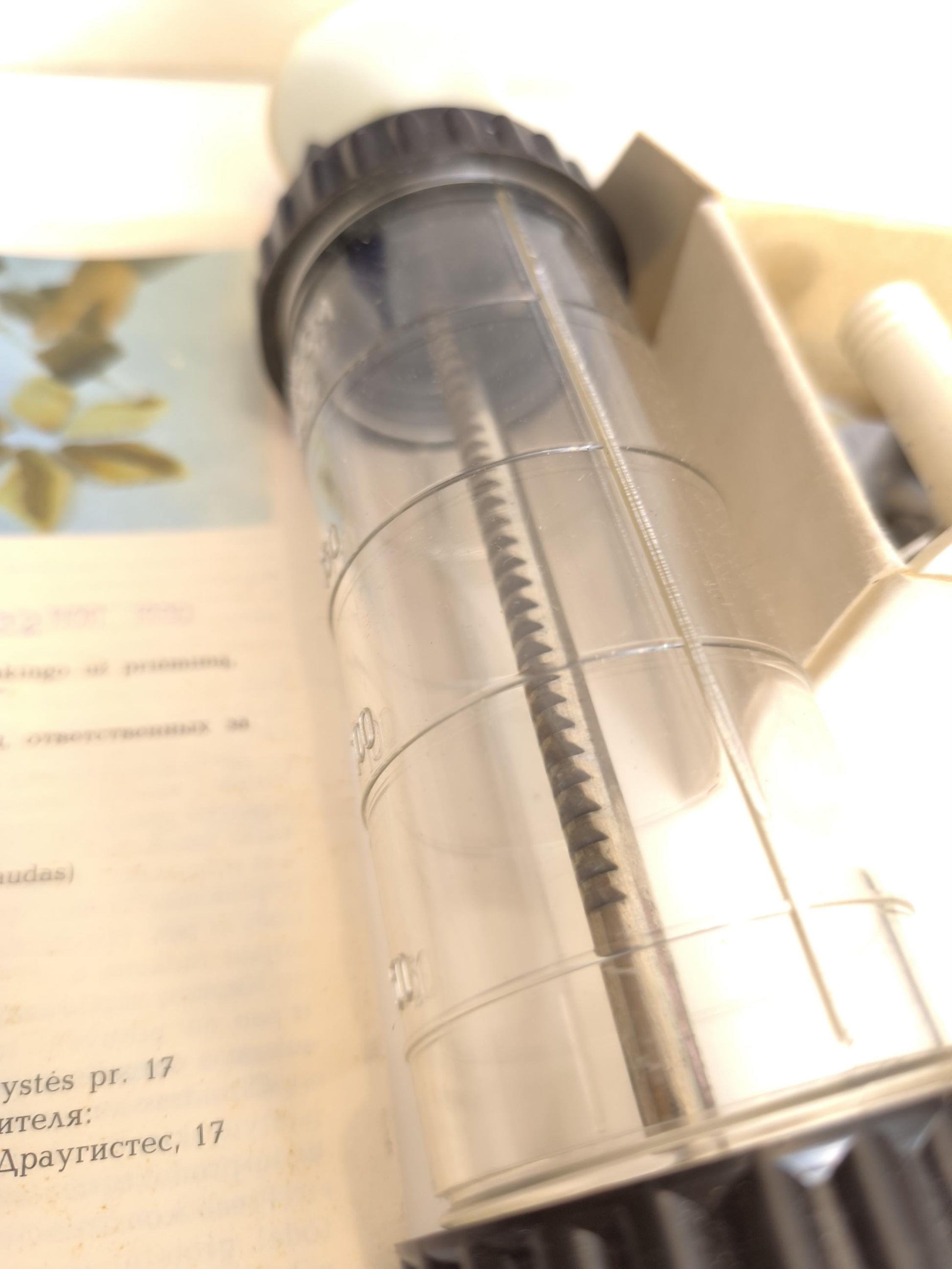 This universal confectionery syringe, manufactured by Sigma at the E. Ozarskis Experimental Automation Factory in Kaunas, Lithuania, in 1990, is designed for easy and quick preparation of cookies in various shapes and for decorating cakes. The set includes multiple shaping attachments, recipes, and an instruction manual, making it ideal for precise and convenient portioning of pastry and frosting.