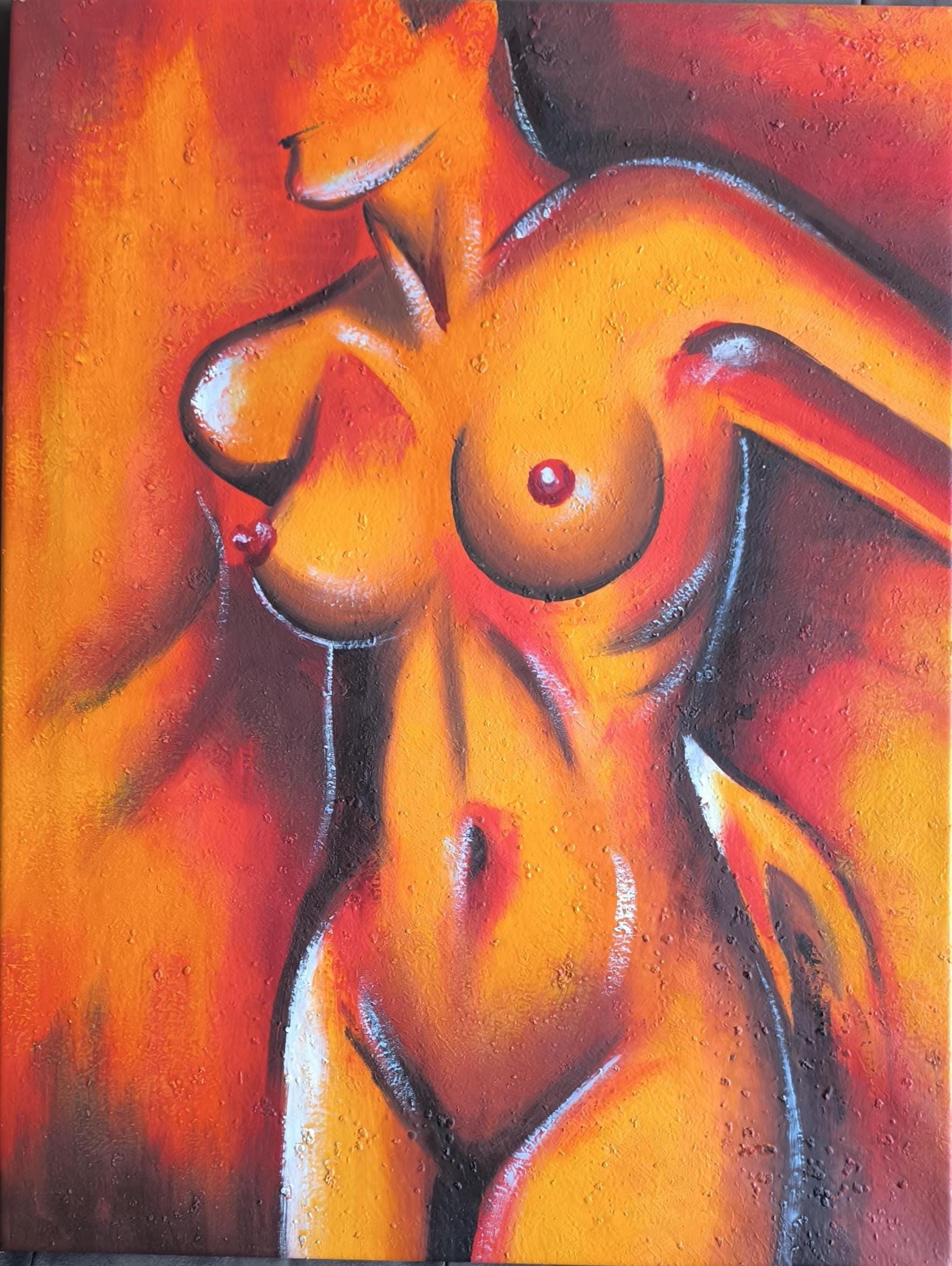 Oil painting on canvas depicting a nude female body, created before 1990. The work is unsigned and unframed, measuring 60 × 80 cm. The style is intimate and classic, focusing on the natural human form with soft, painterly techniques typical of late 20th-century figurative art.