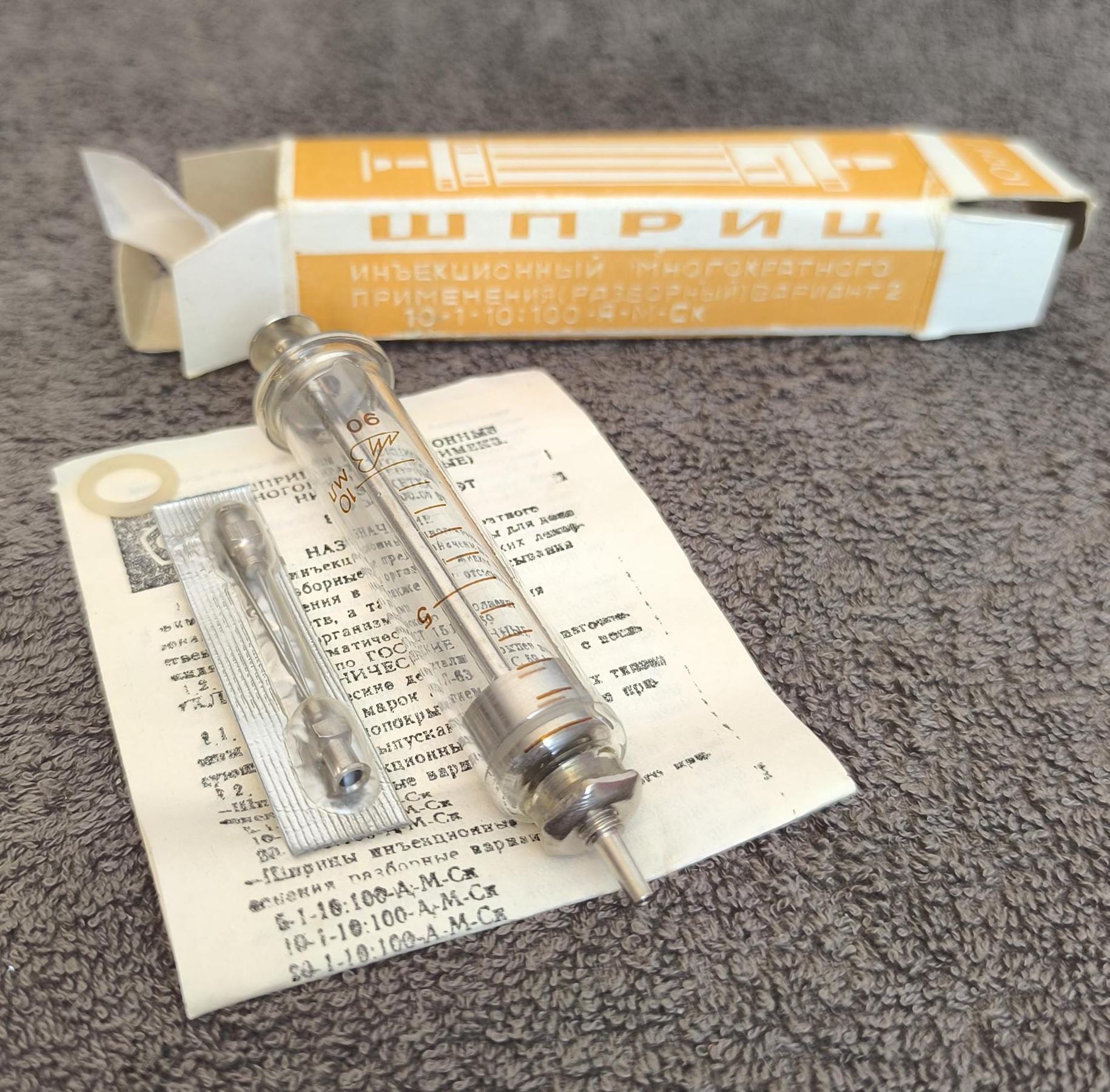 Vintage Soviet medical equipment from the 1990s. This reusable hypodermic syringe, made from stainless steel with a glass body, comes in its original box with two included needles. Ideal for collectors of medical memorabilia.