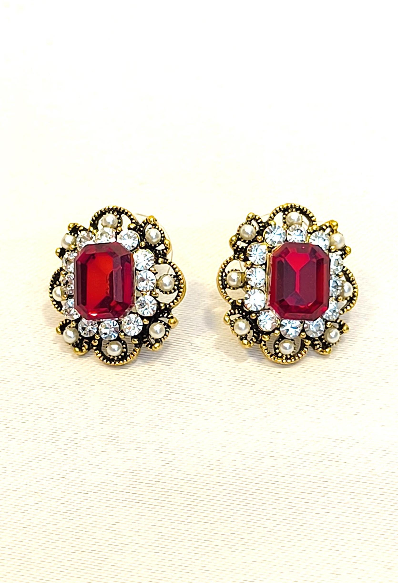 Unused vintage piece from the 2000s. This elegant pair of 14K gold-plated stud earrings showcases a red ruby imitation Swarovski crystal, beautifully accented with diamond imitations. Designed with a classic push-back closure for a secure and comfortable fit.