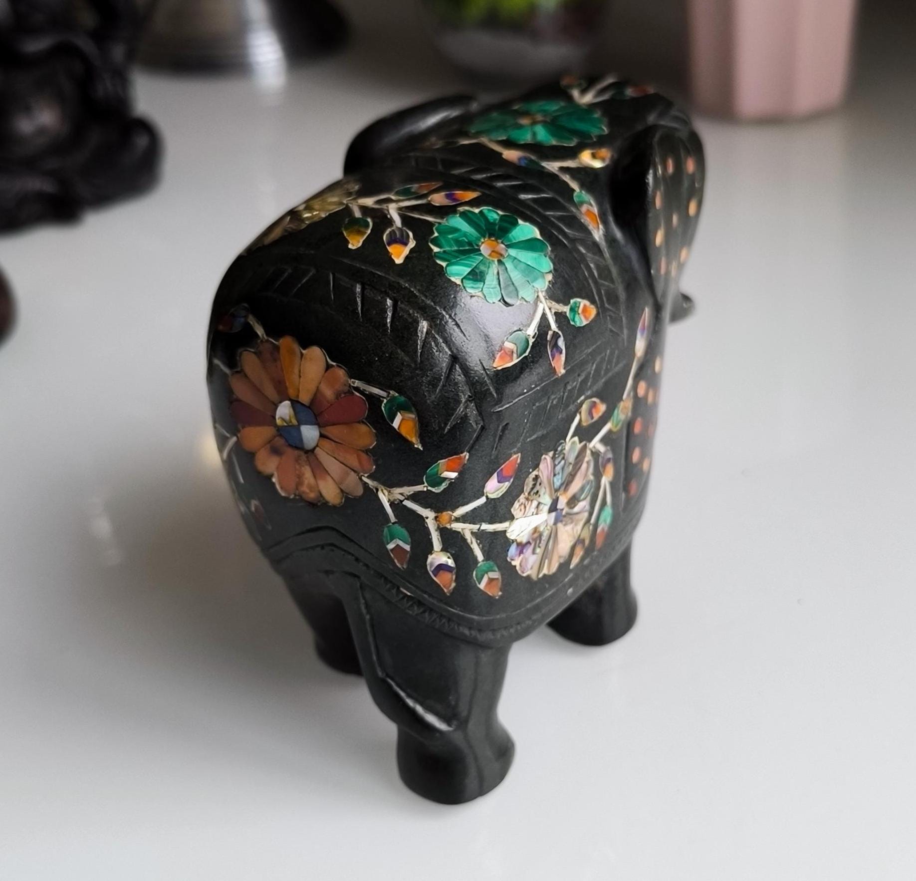 A unique handcrafted black-painted marble elephant statue, adorned with inlaid semi-precious gemstones and shell elements. This 12 cm long, 10 cm high, heavy sculpture from the 1980s showcases exquisite floral detailing and traditional Asian craftsmanship. Perfect for home decor, Vastu, or as a thoughtful good luck gift.