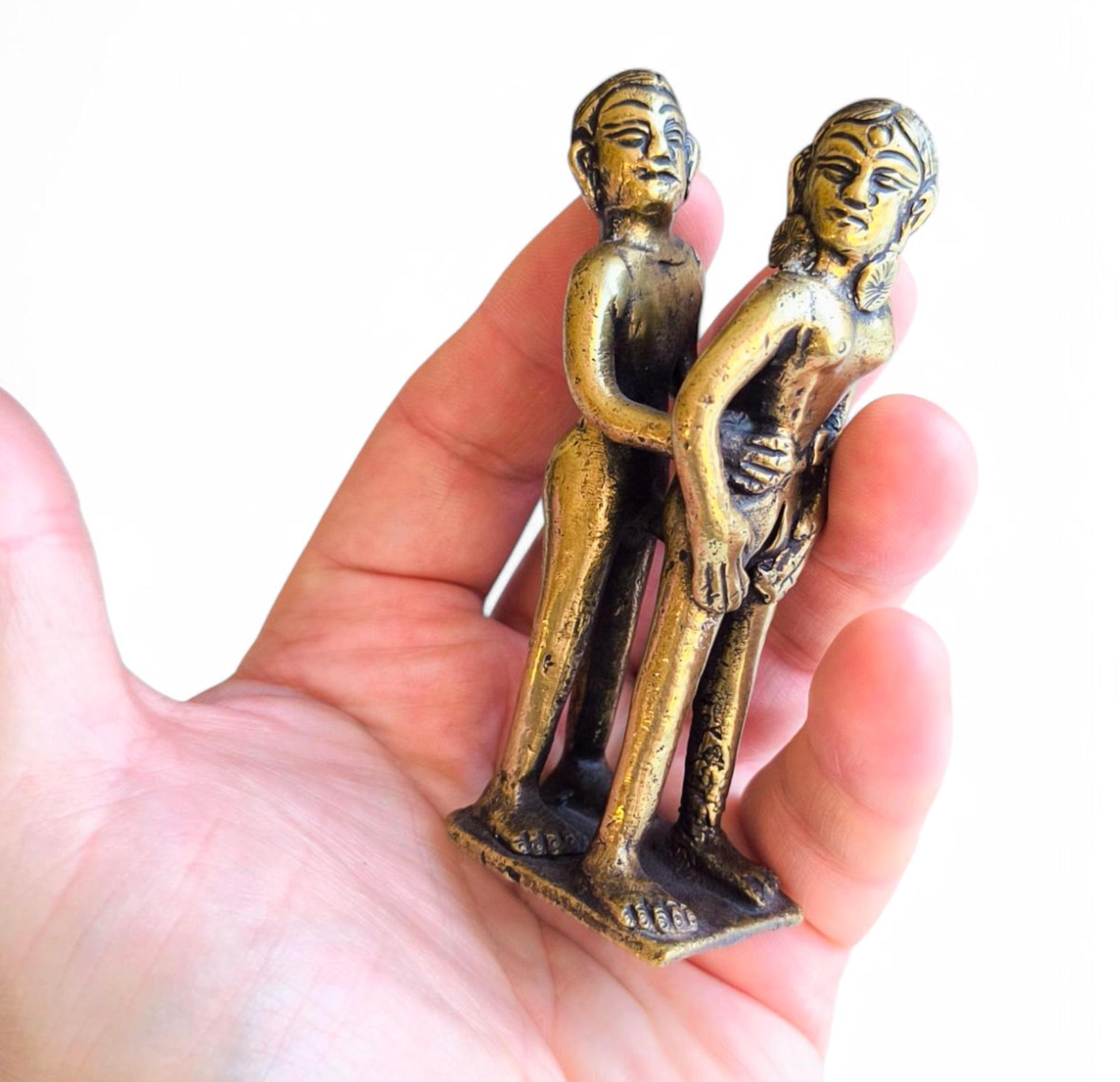 A small vintage bronze erotic statue depicting an Indian Kamasutra couple in an intimate pose. Part of a 1980s collectible series, this amulet symbolizes love, passion, and spiritual connection. A unique home decor piece or meaningful gift.