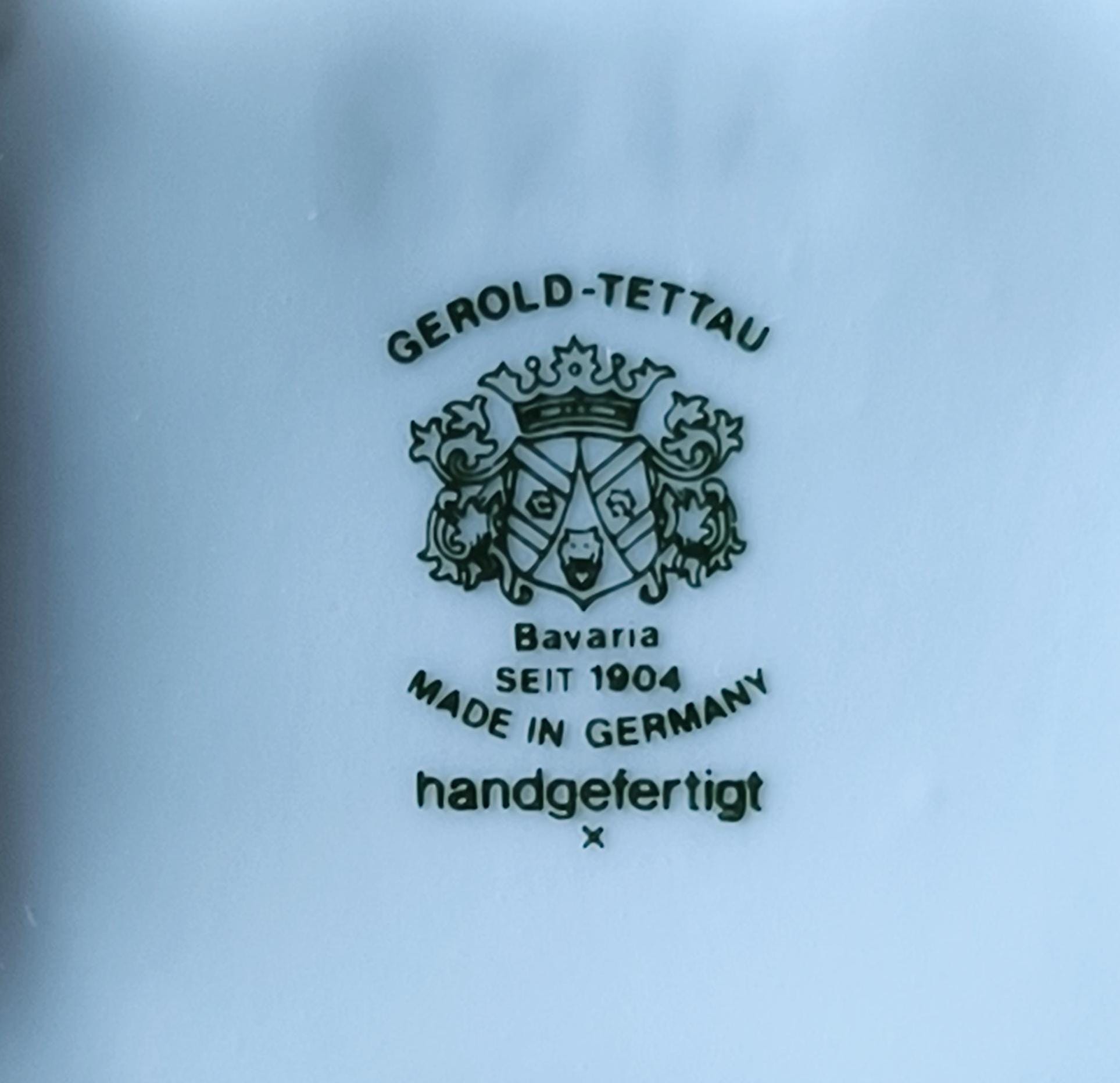 Elegant vintage Gerold Tettau Bavaria mocha espresso cup with saucer, produced between 1960-1993. Made of fine white porcelain with delicate floral motifs, bas-relief monograms, and gold accents in the Baroque style. Handmade and in excellent condition. A beautiful collectible or a refined addition to any coffee set.