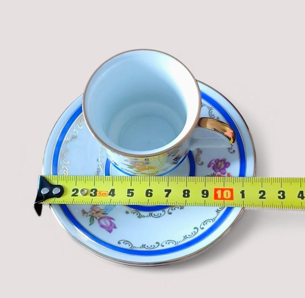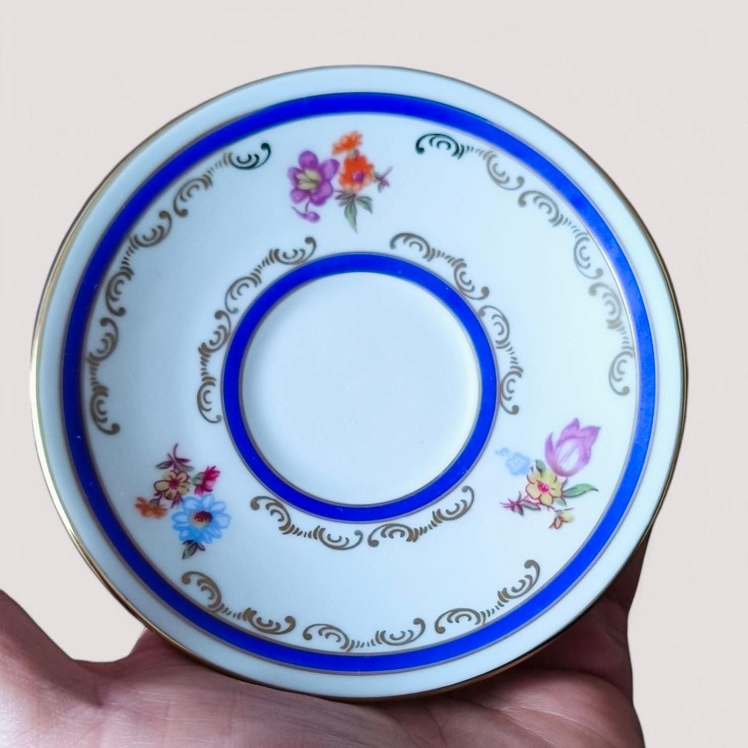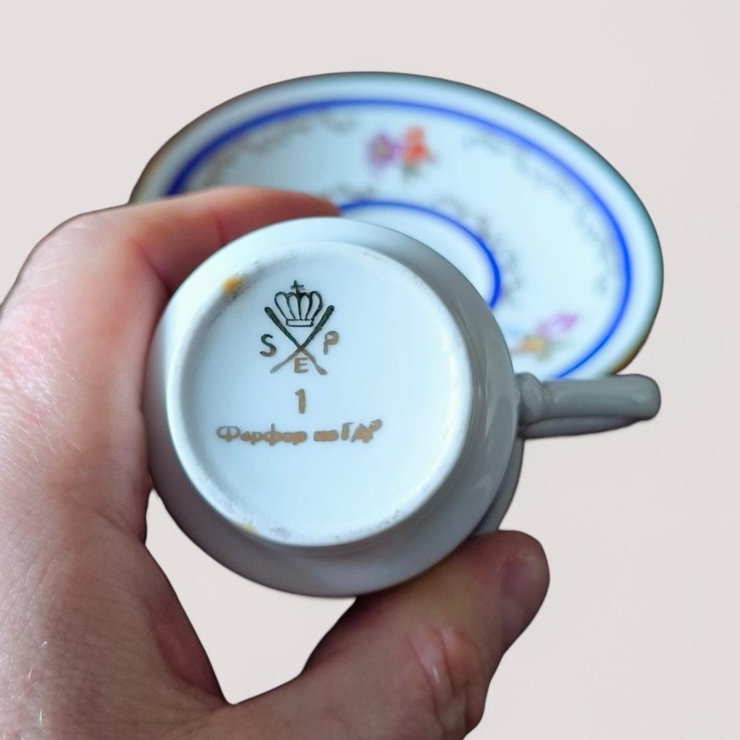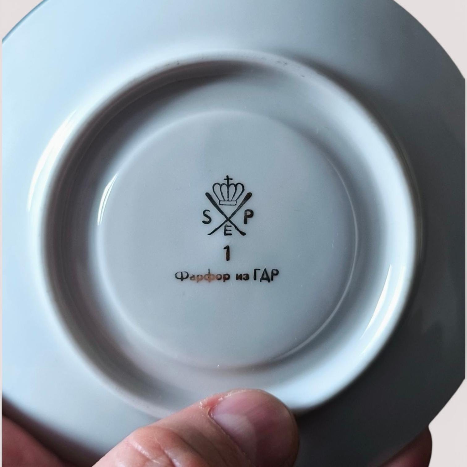 Elegant vintage porcelain coffee cup and saucer by SPE Eisenberg, made in the GDR in the 1970s. Features delicate hand-painted floral motifs, gilded edges, and a refined filigree design. Suitable for coffee, mocha, or espresso. Stamped and signed in gold at the bottom. In excellent condition, perfect for collectors or vintage kitchen decor.