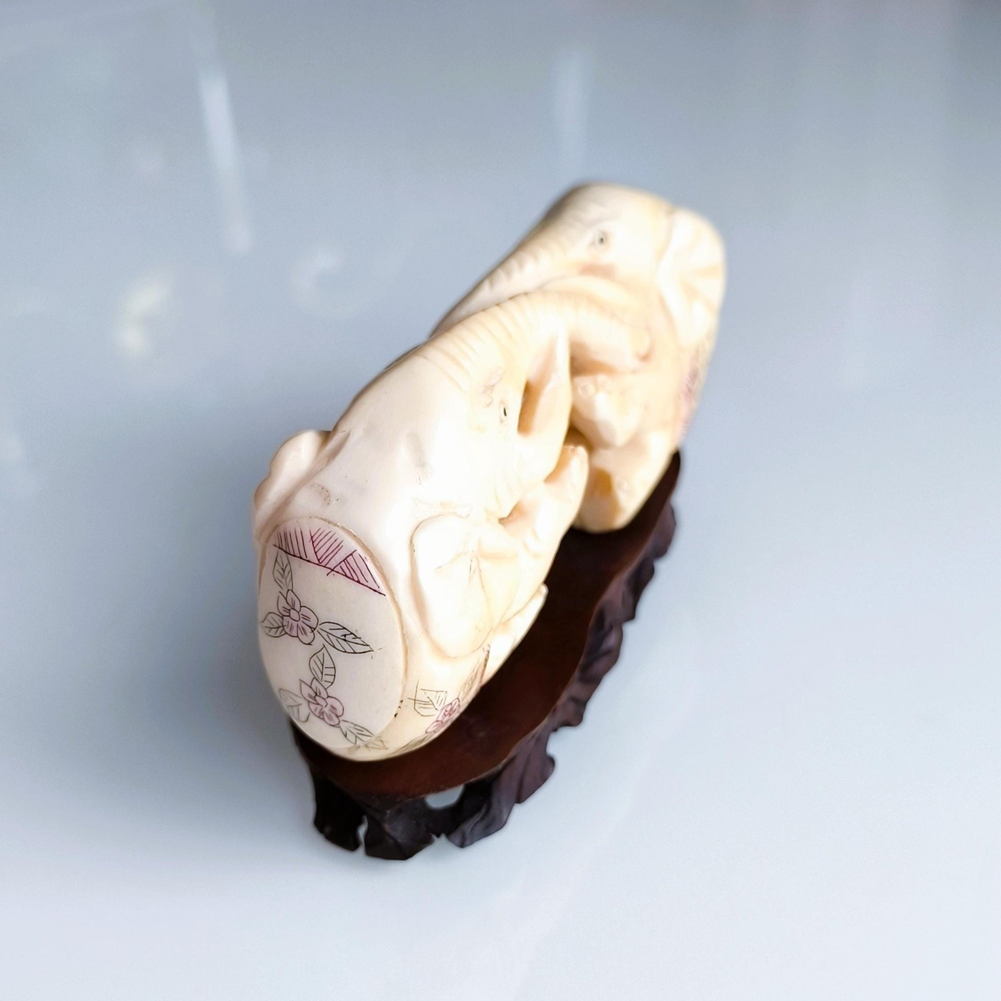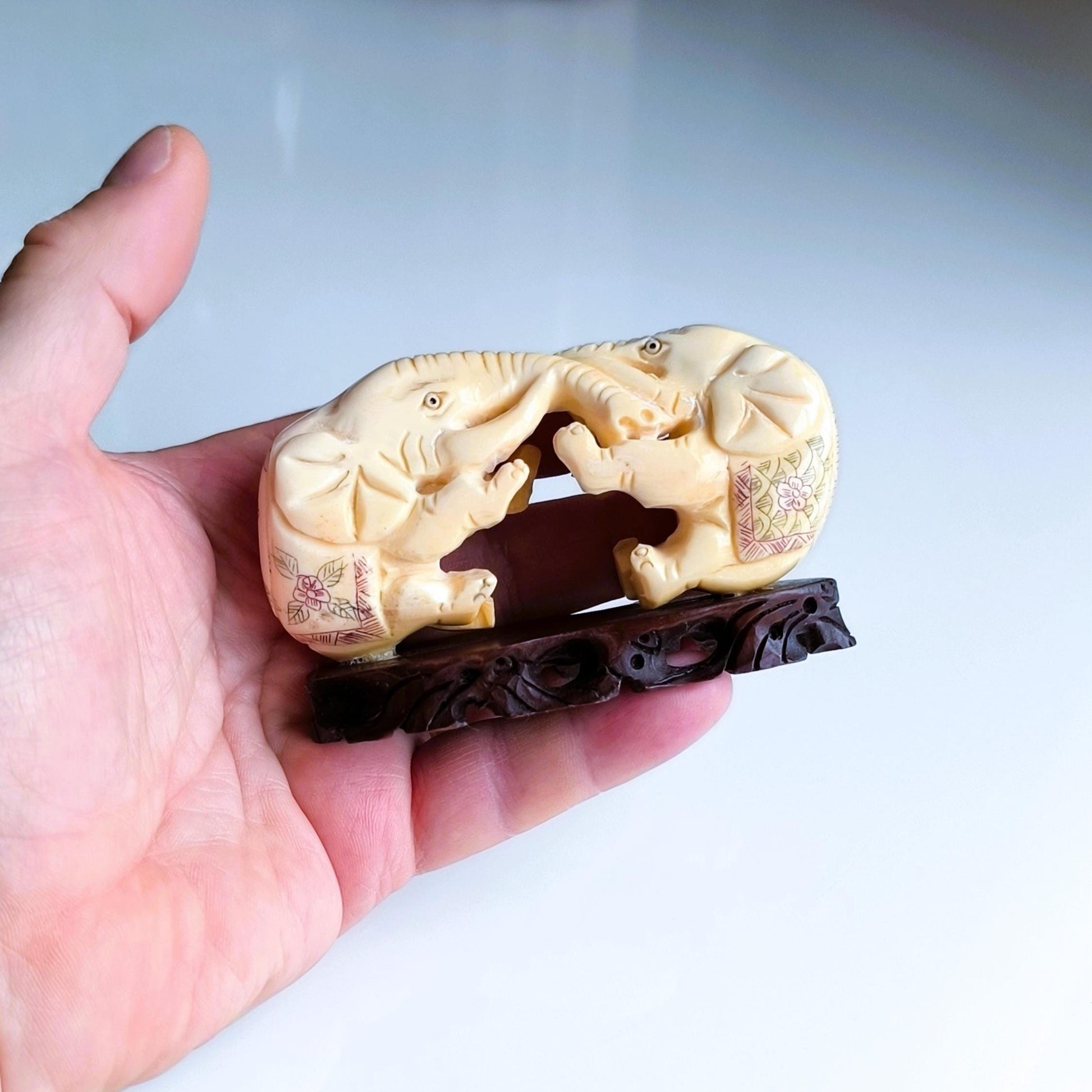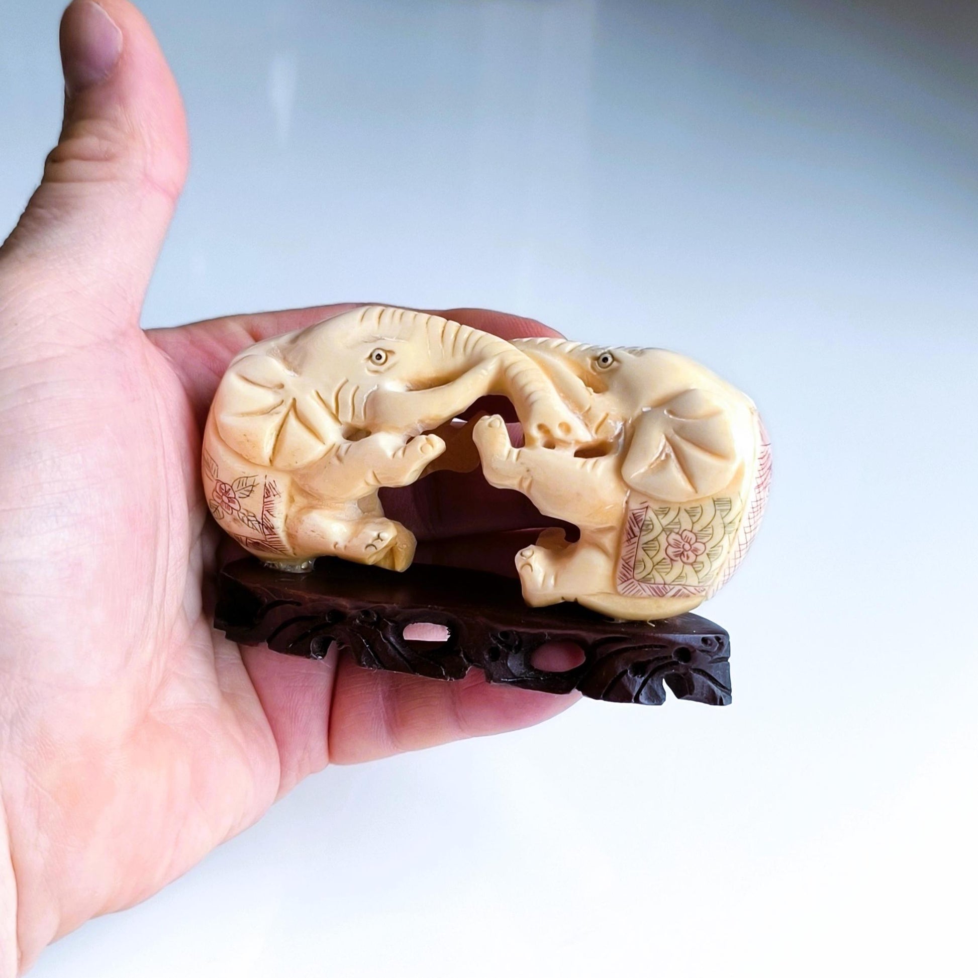 Handmade white stone sculpture of two elephants on a wooden base, traditional Asian decorations. This detailed 1960s piece reflects traditional craftsmanship and cultural artistry. A unique decorative collectible for home or office.
