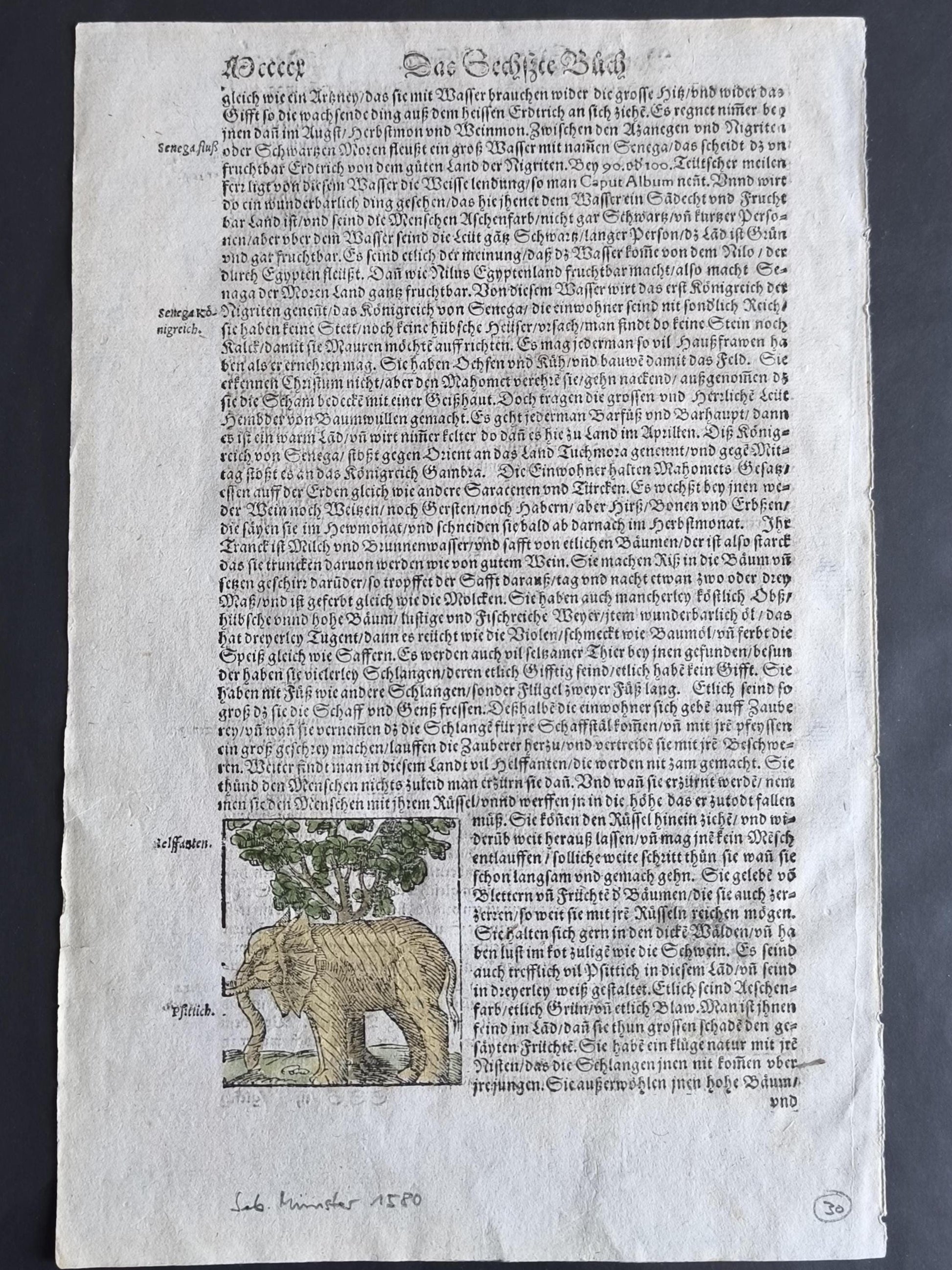 Original woodcut print with hand coloring from Sebastian Münster’s Cosmographia, ca. 1580. Printed on both sides with text in old German. Depicts exotic and mythological scenes from Africa and Asia, including an elephant with a tree, human figures, and landscape activities. Sheet size approx. 32 × 21 cm. A rare page from one of the most significant Renaissance geographical works.